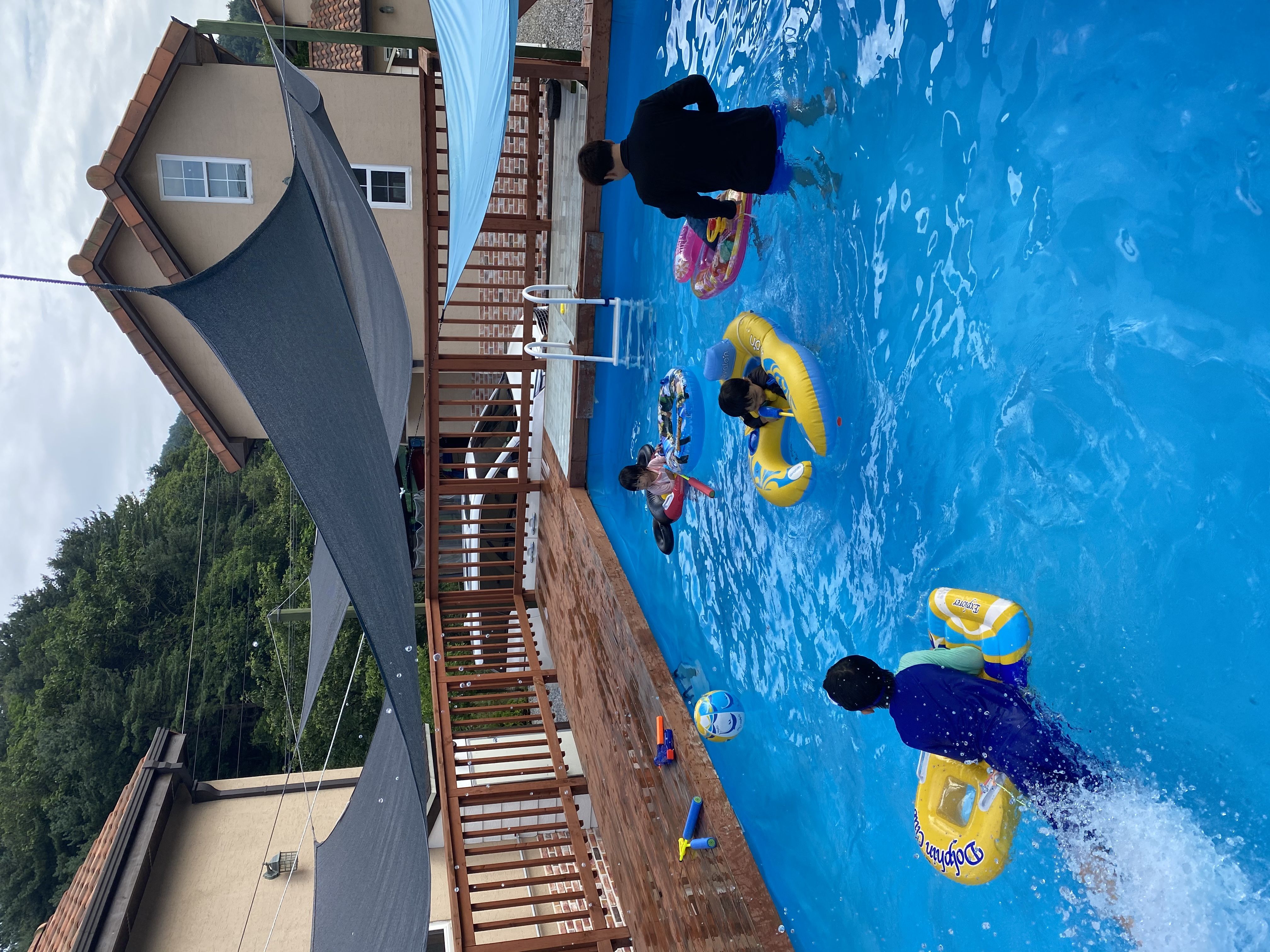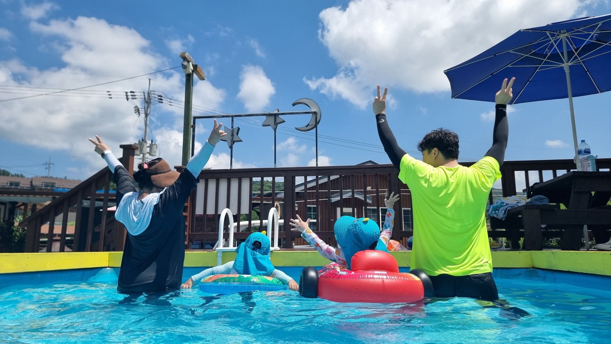 펜션이에요. 대부분 어린아이들을 데리고 온 부모님들이니까 그런 도구가 있는 거죠. 수영장이 그렇게 깊지 않은 것 같은데요? 아이들이 더 편하게 이용할 수 있을 것 같아요.