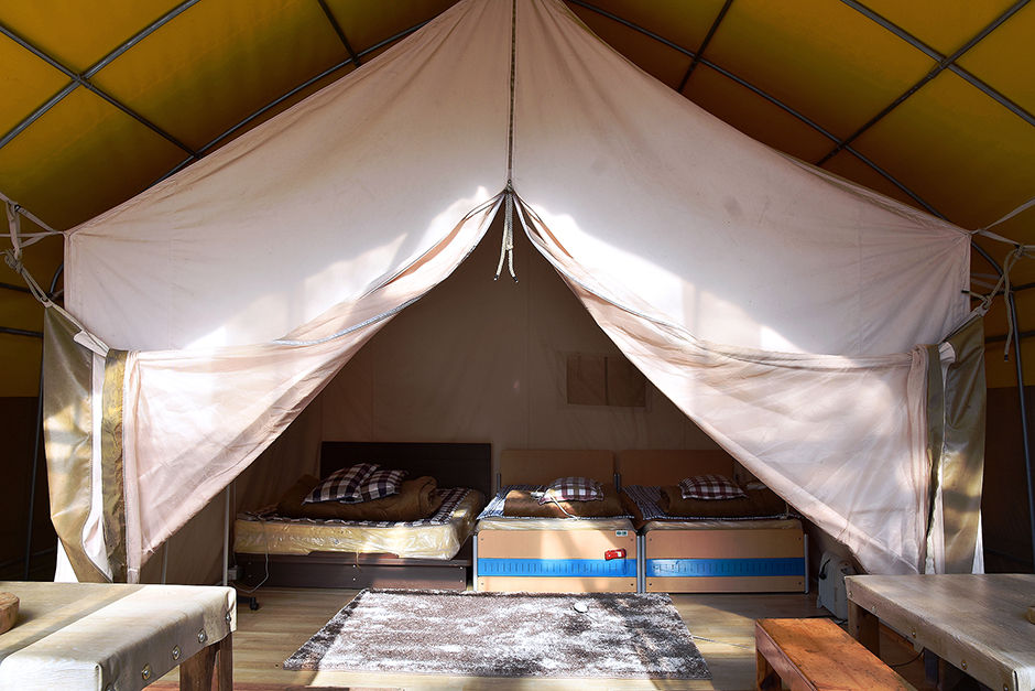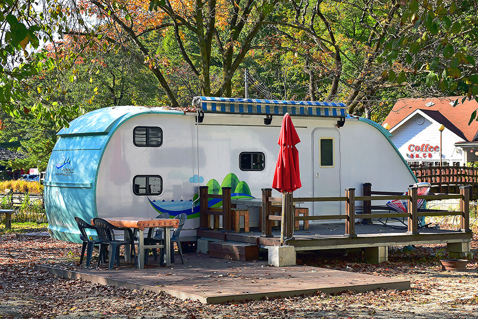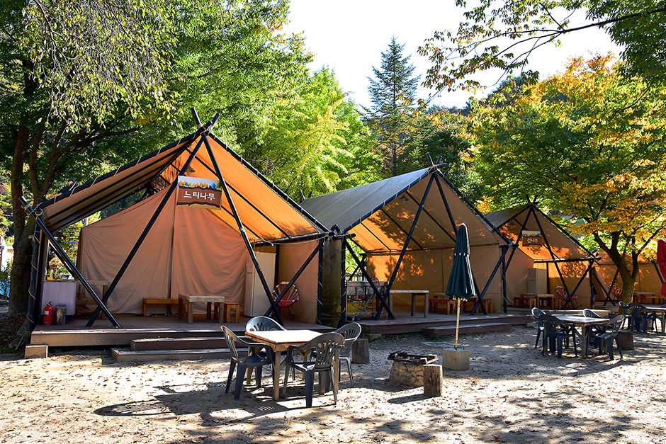 산정호수 가족글램핑장은 이름처럼 포천 산정호수 내에 자리하는 곳으로 산정호수 마을회 주민들이 운영하고 있다. 16,000제곱미터 가까이 되는 면적에 10개의 데크 사이트가 있는 일반야영장, 글램핑 10동, 카라반 2대로 글램핑장뿐만 아니라 카라반 숙박과 캠핑도 가능하다. 캠핑장 바로 뒤에는 산정호수 폭포가 있어 폭포소리를 들으며 캠핑할 수 있다. 또한 글램핑장 바로 옆으로 산정호숫가 산책로로 이어지는 길이 있어 가볍게 오솔길 산책을 하며 다람쥐도 보며 걸을 수 있다. 글램핑장은 특별히 화려하고 요란한 야경이나 시설은 없지만 저녁이 되면 특유의 분위기를 연출한다. 해가 지고 완전히 어두워지기 전인 저녁 시간에 글램핑장에 불이 들어오면 수영장 물가에 조명이 은은하게 비춰 아름다운 풍경을 자아낸다. 특히 수영장 수면이 잔잔히 떨릴 때는 고요 속의 평화를 느낄 수 있다.
