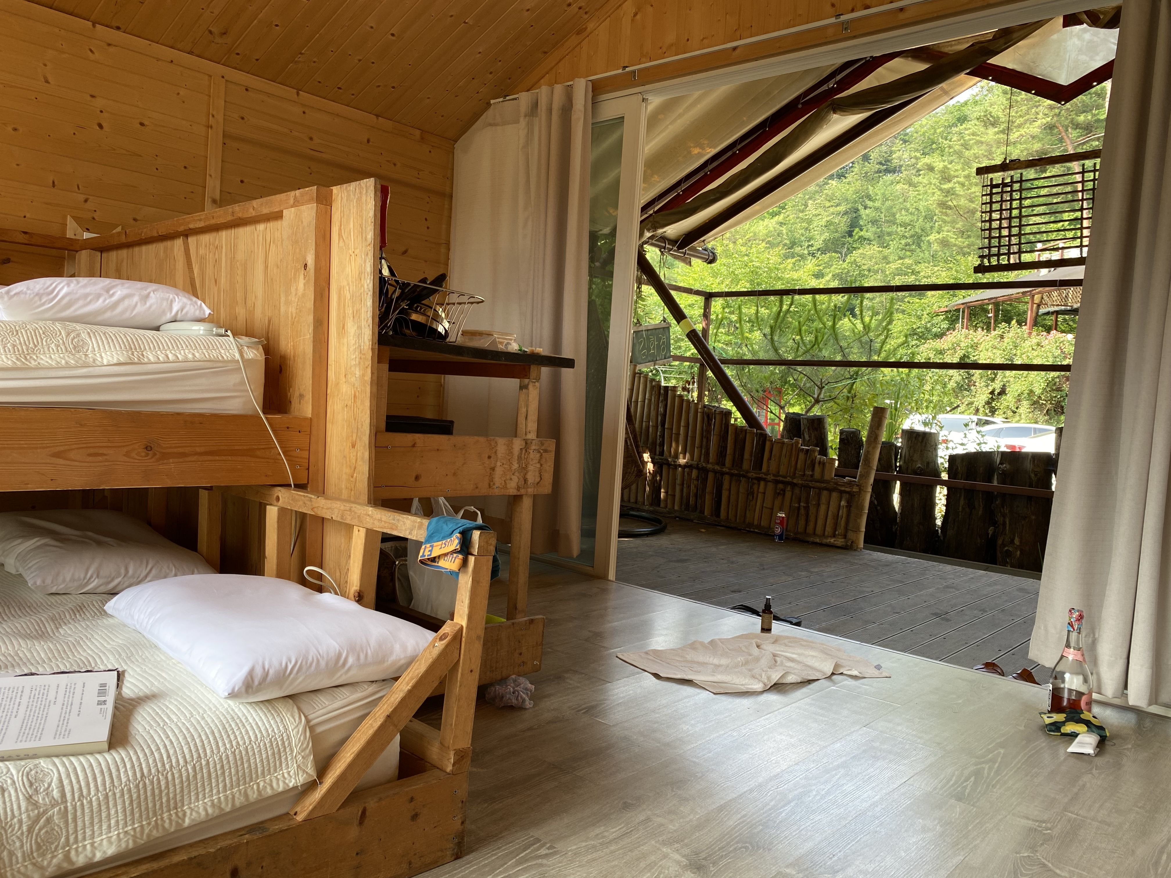 글램핑안이 원목으로 되어 있어 깔끔하고 침구는 조금 촌스럽지만 세탁한 향이 나서 깨끗한 느낌이에요 잠은 잘 와요.