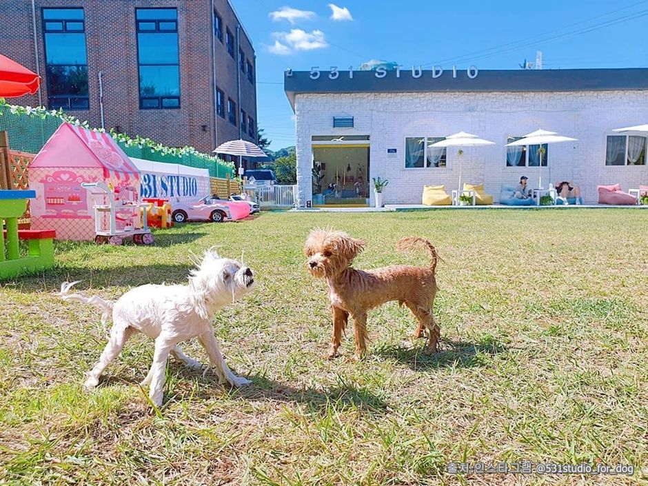 지하수로 관리되는 약 496㎡의 천연 잔디가 있는 반려견 카페이다.