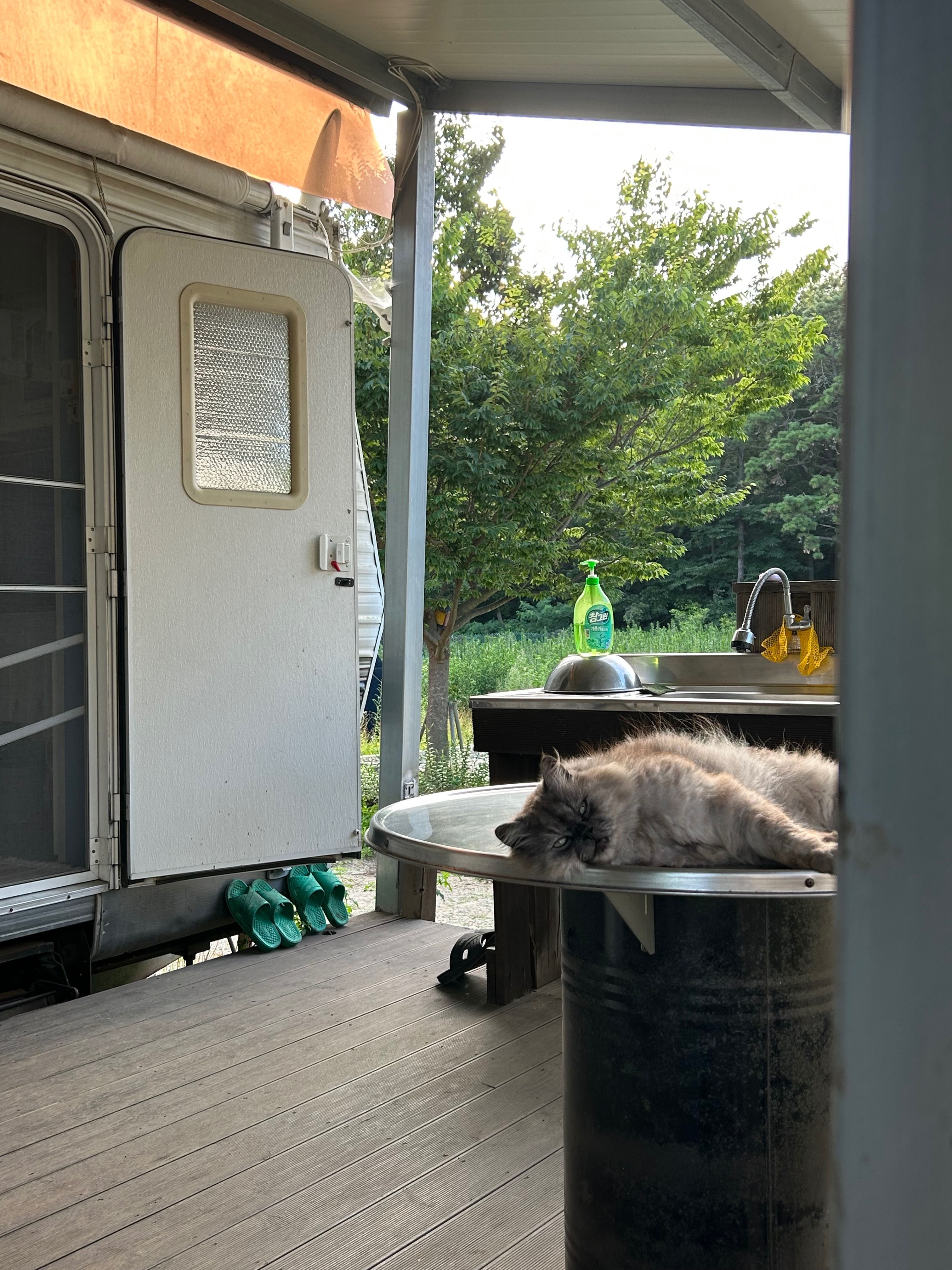 고양이들도 있고 조용하고 너무 좋았어요 주인 할아버지가 엄청 신경써주셔서 불편한거 없이 시골집에 놀러온것처럼 지내다 갔어요 카라반은 오래되어서 낡고 냄새가 어쩔수없이 좀 나는데 비유하면 딱 시골 할머니네집 냄새랑 똑같아서 시골에 온것같았습니다 장판도 있어서 엄청 지지며 꿀잠잤어요