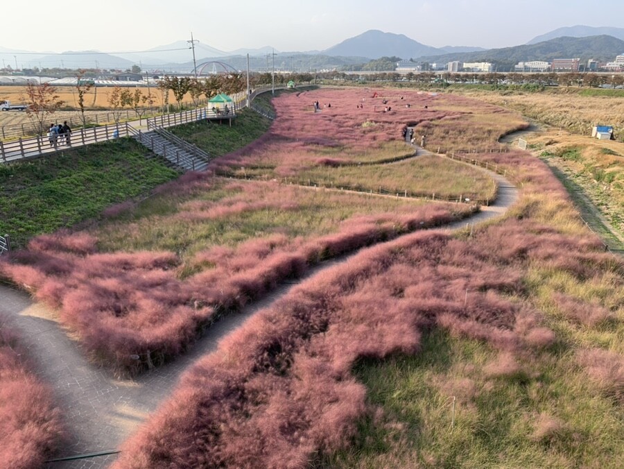 강변공원은 김천을 대표하는 산책로이자 휴식 공간이다. 이곳은 20,000㎡의 면적에 주차장, 놀이마당, 다목적광장, 배드민턴장 등 각종 편의시설이 마련되어 있다. 김천 시민들로부터 기증받은 수목류와 돌을 이용해 조경 시설을 만들었다. 강변공원은 가을철에 접어들면 핑크뮬리가 장관을 이룬다. 이 덕분에 김천 시민은 물론 전국 각지에서 찾아온 관광객으로 인산인해를 이룬다.