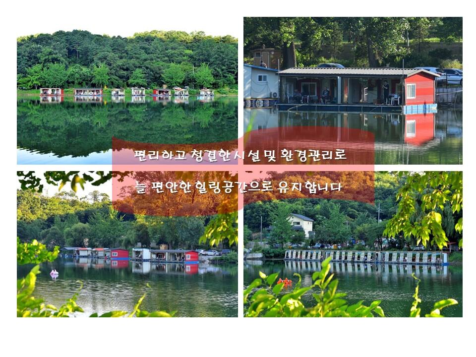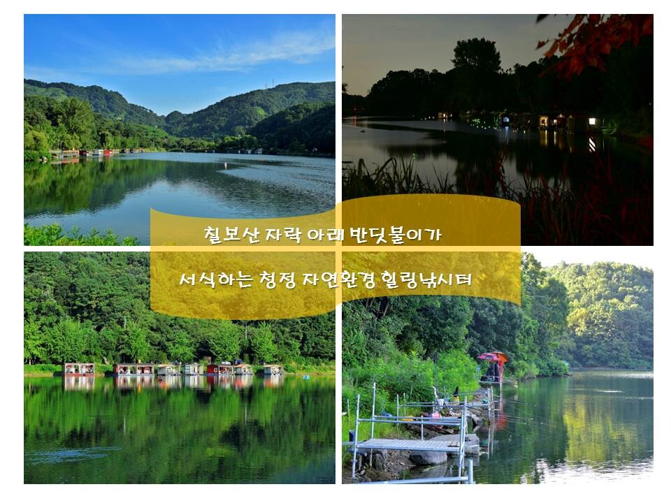 칠보산의 청정 계곡수가 유입되어 항상 맑은 공기와 수질을 자랑하며 반딧불이가 서식할 만큼 청정지역이다, 담수 면적은 66,000㎡로 주 어종은 토종붕어, 수입 붕어, 향어, 잉어, 메기, 가물치 등으로 어자원이 풍부한 낚시터이다. 단, 최대 수심이 15m 이상으로 깊어 주의가 필요한 낚시터이다. 칠보산을 바라보는 방향으로 수상 좌대와 잔교, 사무실 등이 위치해 있다.