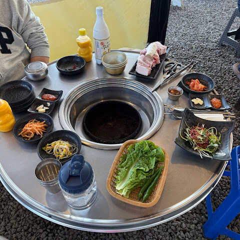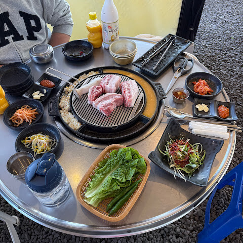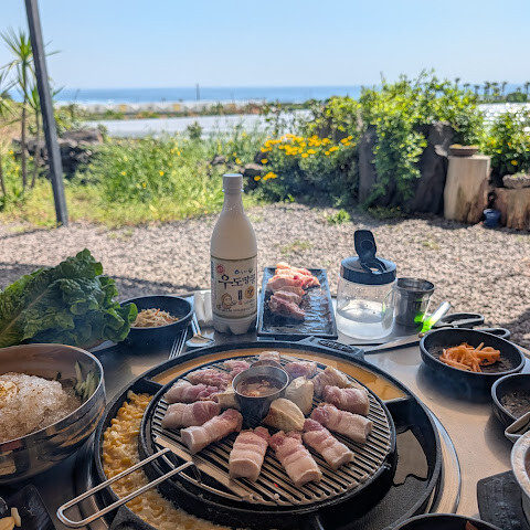 광활한 자연과 바다의 탁 트인 전망을 감상할 수 있는 숯불 흑돼지 전문점입니다. 바닥에 자갈이 깔린 야외 그릴 테이블은 캠핑 기분을 선사합니다. 흑돼지 외에도 해산물 바비큐도 제공하는데, 모든 재료는 사장님 어머니가 매일 바다에서 직접 공수합니다. 제주도 바비큐 소스는 보통 멸치 소스이지만, 이곳만의 특별한 비법인 도미 소스를 사용하여 더욱 진하고 풍부한 맛을 선사합니다. 계란찜과 치즈콘도 그릴판 가장자리에 올려 함께 구워내는데, 이 또한 특별합니다. 제가 제주도에서 먹어본 흑돼지 구이집 중 세 곳 중 가장 맛있는 곳입니다.