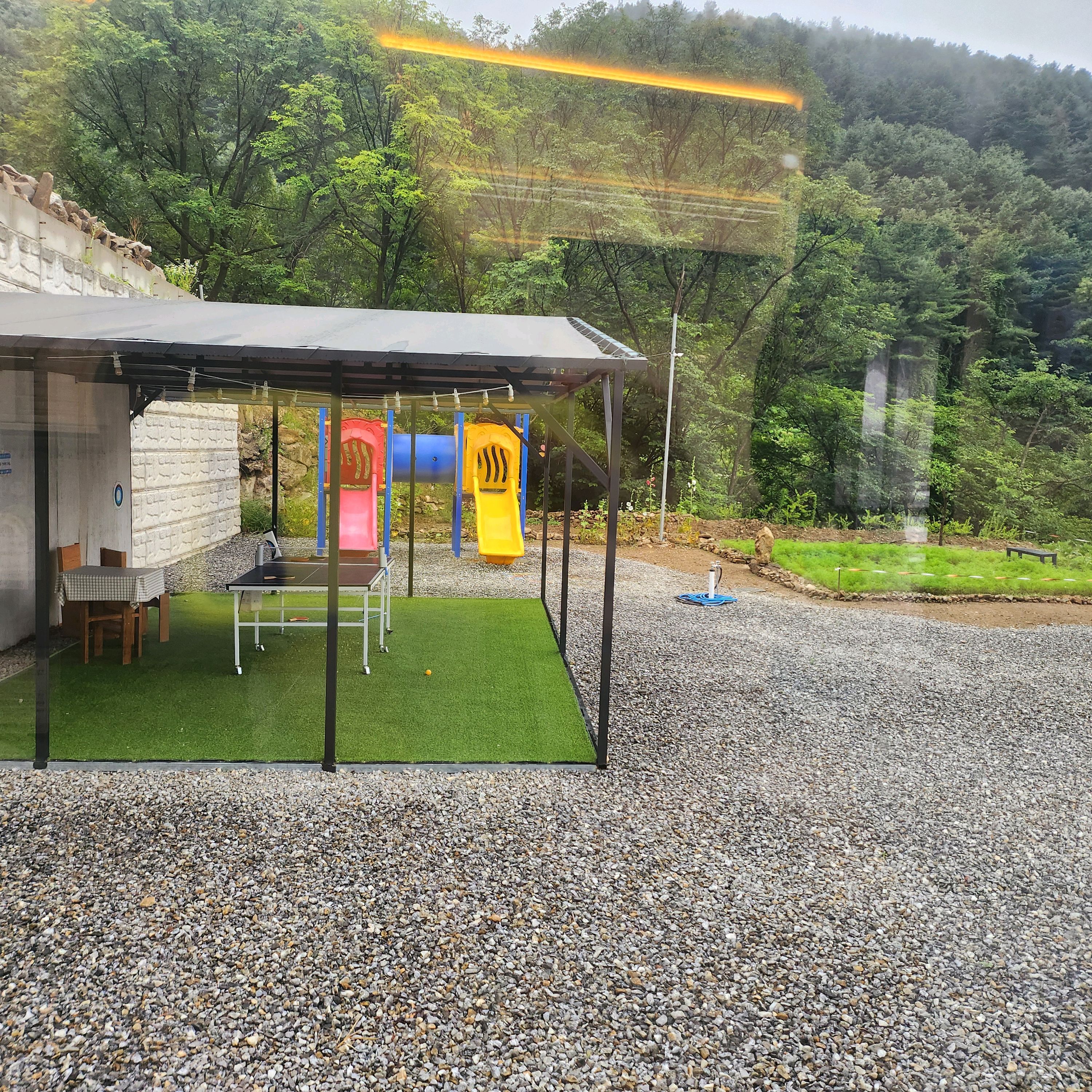 바로 밑에 계곡도 있고, 배드민턴 탁구 방방이 등 놀거리가 아주 많아용 시간 가는줄도 모르고 노는중입니당😆