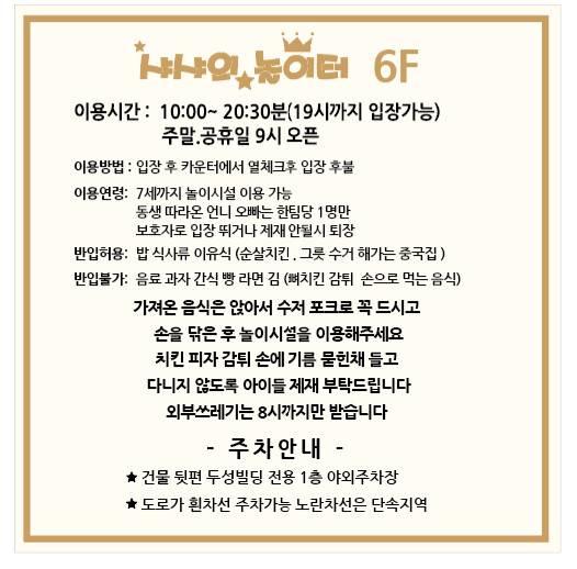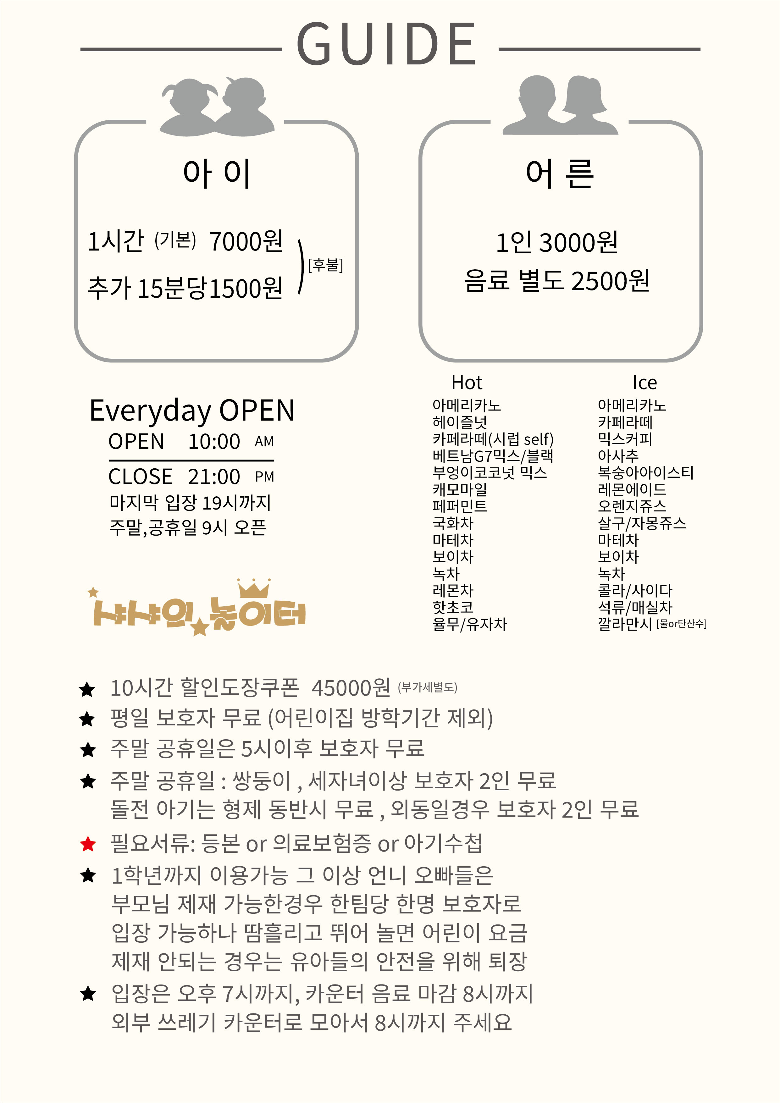 * 입장료 : 어린이 7,000원 / 어른 3,000원 (음료 별도)