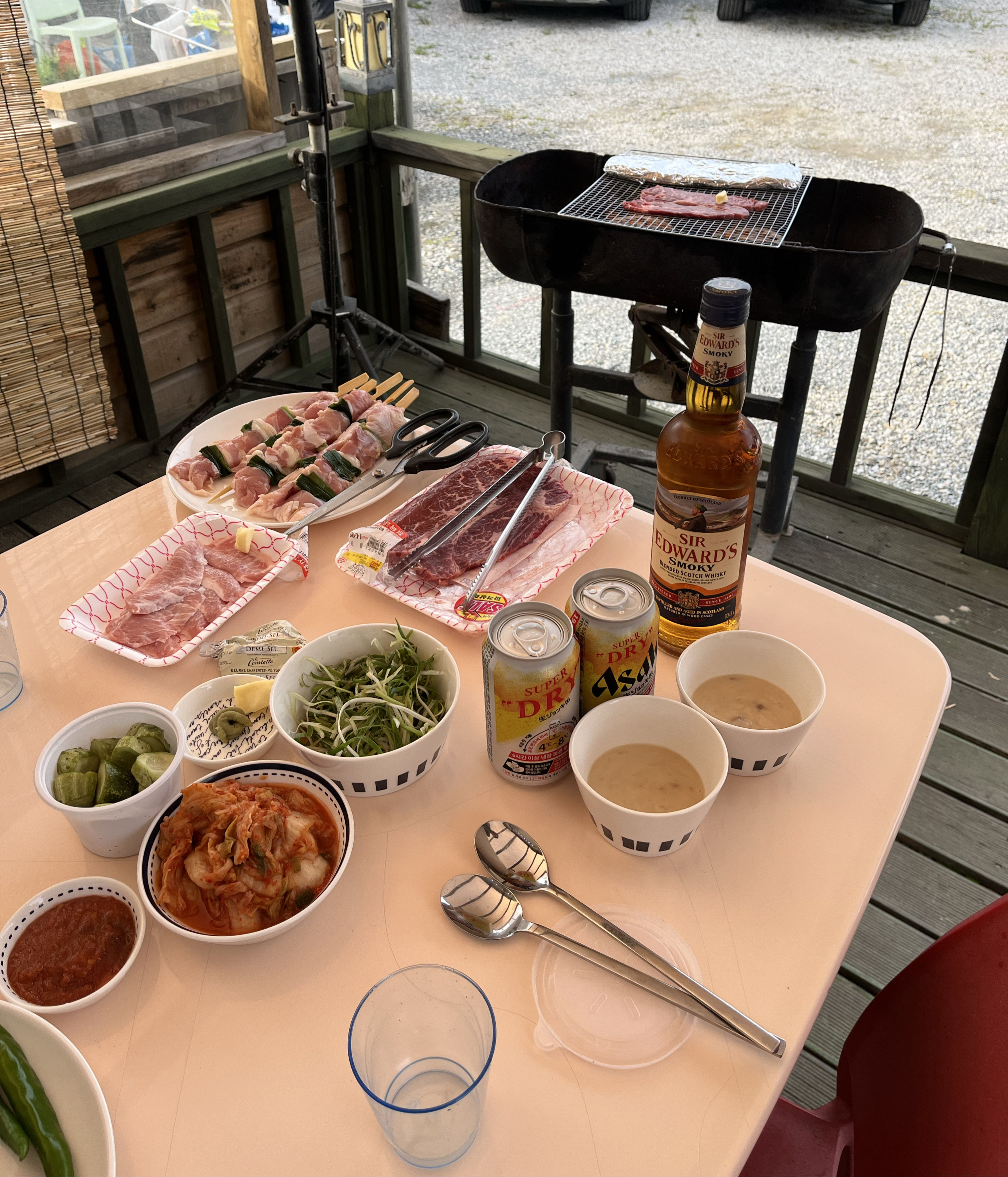 안에서 밥먹기도 좋고 밖에는 나무테이블과 바베큐도 이용됩니다! 천연 야자수 숯이라고 했던것같은데 고기 구워먹으니