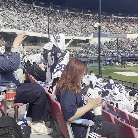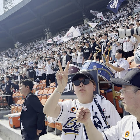 이 야구 경기장은 정말 환상적이에요. 현장감이 강렬하죠. 공격할 때는 모두가 함께 응원하고, 휴대폰을 보는 사람은 거의 없어서 다들 집중력이 최고예요!