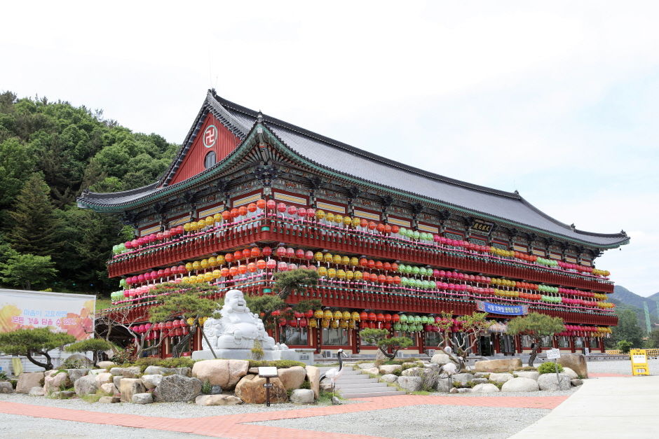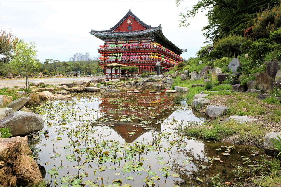 천태종 사찰로 1995년 지어졌다. 사찰에는 웅장함이 느껴지는 3층 높이의 대적광전을 비롯해 포대화상, 대자대비 관음보살상 등이 있다. 사찰은 유성 IC와 서대전 IC에서 가깝고, 주변에는 국립대전숲체원, 유성온천 등이 있다. (사진 출처: 대전시 공식 블로그) |