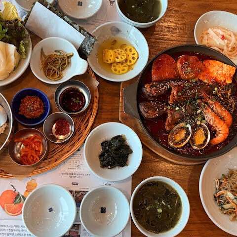 해물탕은 풍미가 가득했고, 홍합, 새우, 두부, 무가 푸짐하게 들어있었습니다. 국물은 과하지 않으면서도 적당히 매콤했습니다. 반찬 종류도 다양했고, 특히 연근과 잡채가 마음에 들었습니다. 생선 튀김은 바삭하고 양념도 완벽했습니다. 점심시간에 서빙이 좀 늦어서 별 하나 뺐지만, 전반적으로 훌륭한 식사였습니다.