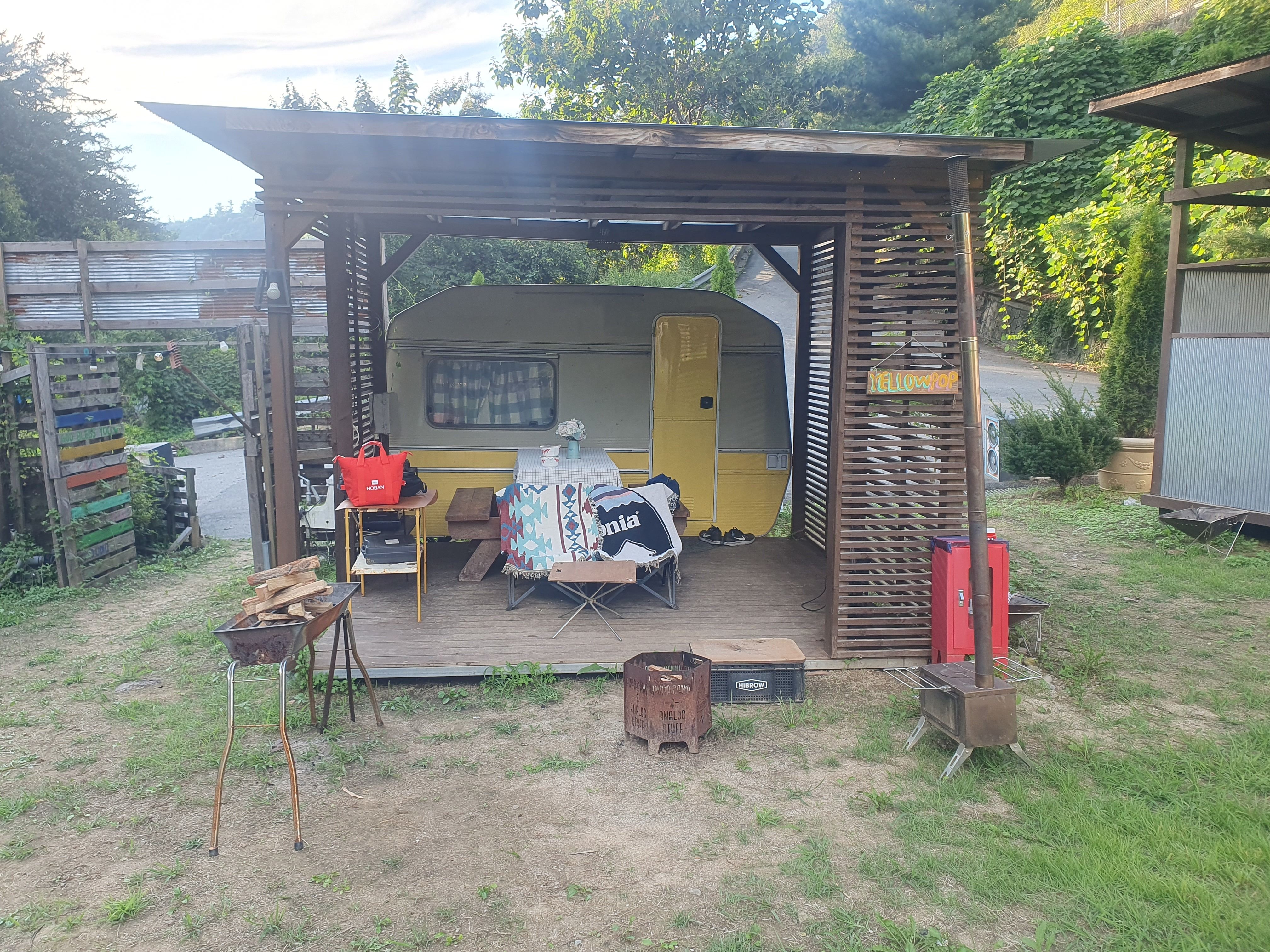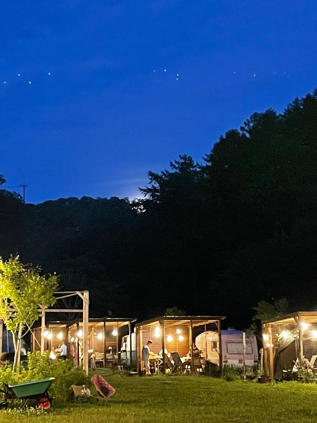바베큐 세트 시켰는데, 야채꼬지2개 목살 삼겹살 반찬 컵라면 이렇게 나오는데 비싼감이 있는데, 양은 괜찮았던것 같습니다. 마트가 생각보다 거리가 좀 있어서 오기전에 장은 다 보고 오길 추천합니다. 밤되고 전등켜지고 불피워놓으니 분위기좋고, 카라반은 작아보이는데 성인2명 잘만하고 생각보다 아늑하고 좋네요.