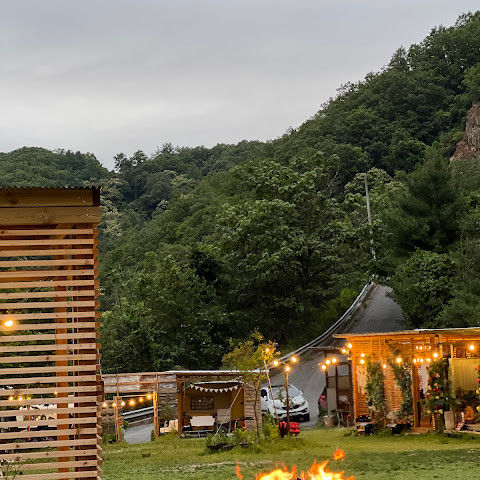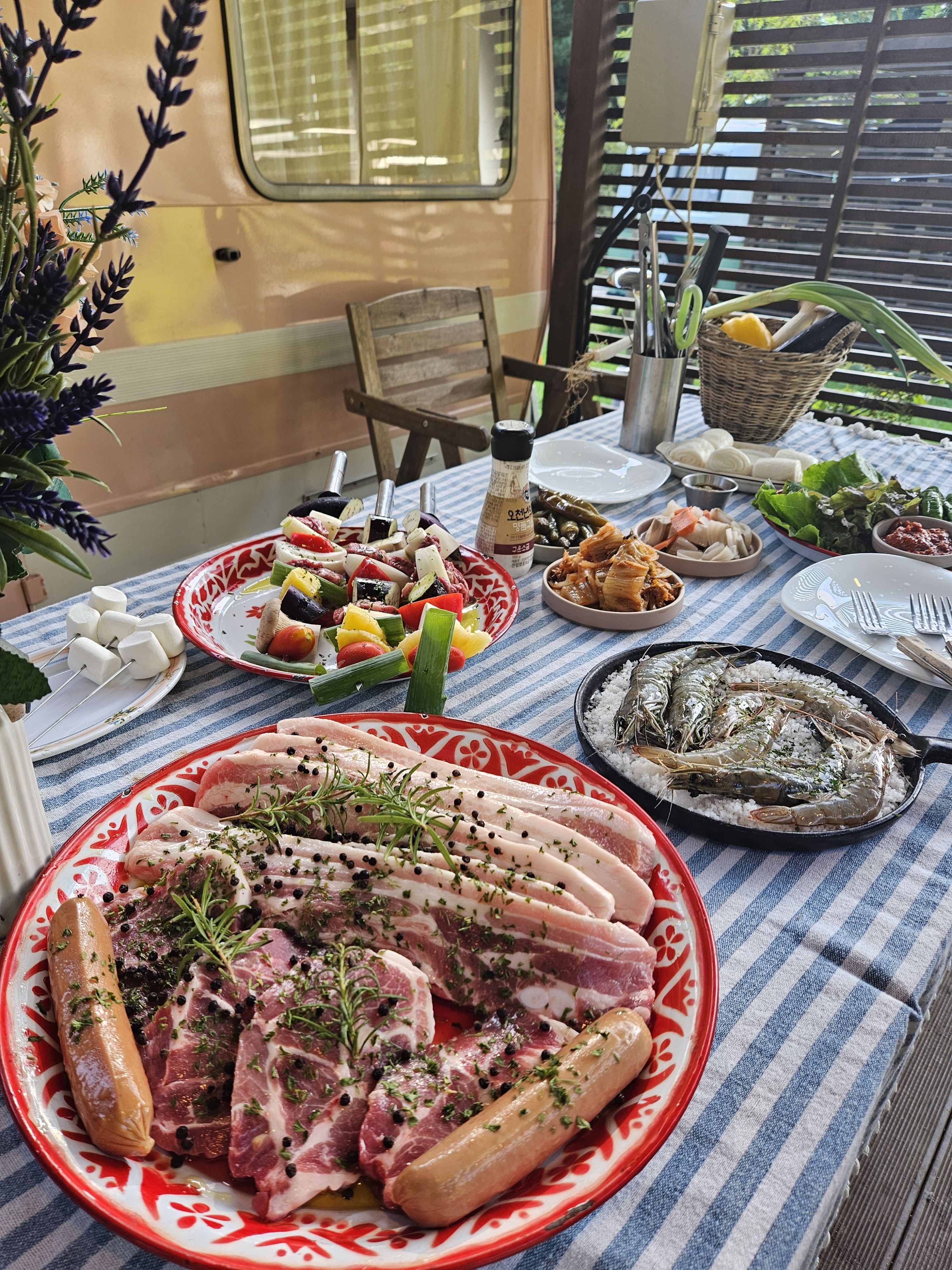 바베큐 세트 시켰는데, 야채꼬지2개 목살 삼겹살 반찬 컵라면 이렇게 나오는데 비싼감이 있는데, 양은 괜찮았던것 같습니다. 마트가 생각보다 거리가 좀 있어서 오기전에 장은 다 보고 오길 추천합니다. 밤되고 전등켜지고 불피워놓으니 분위기좋고, 카라반은 작아보이는데 성인2명 잘만하고 생각보다 아늑하고 좋네요.