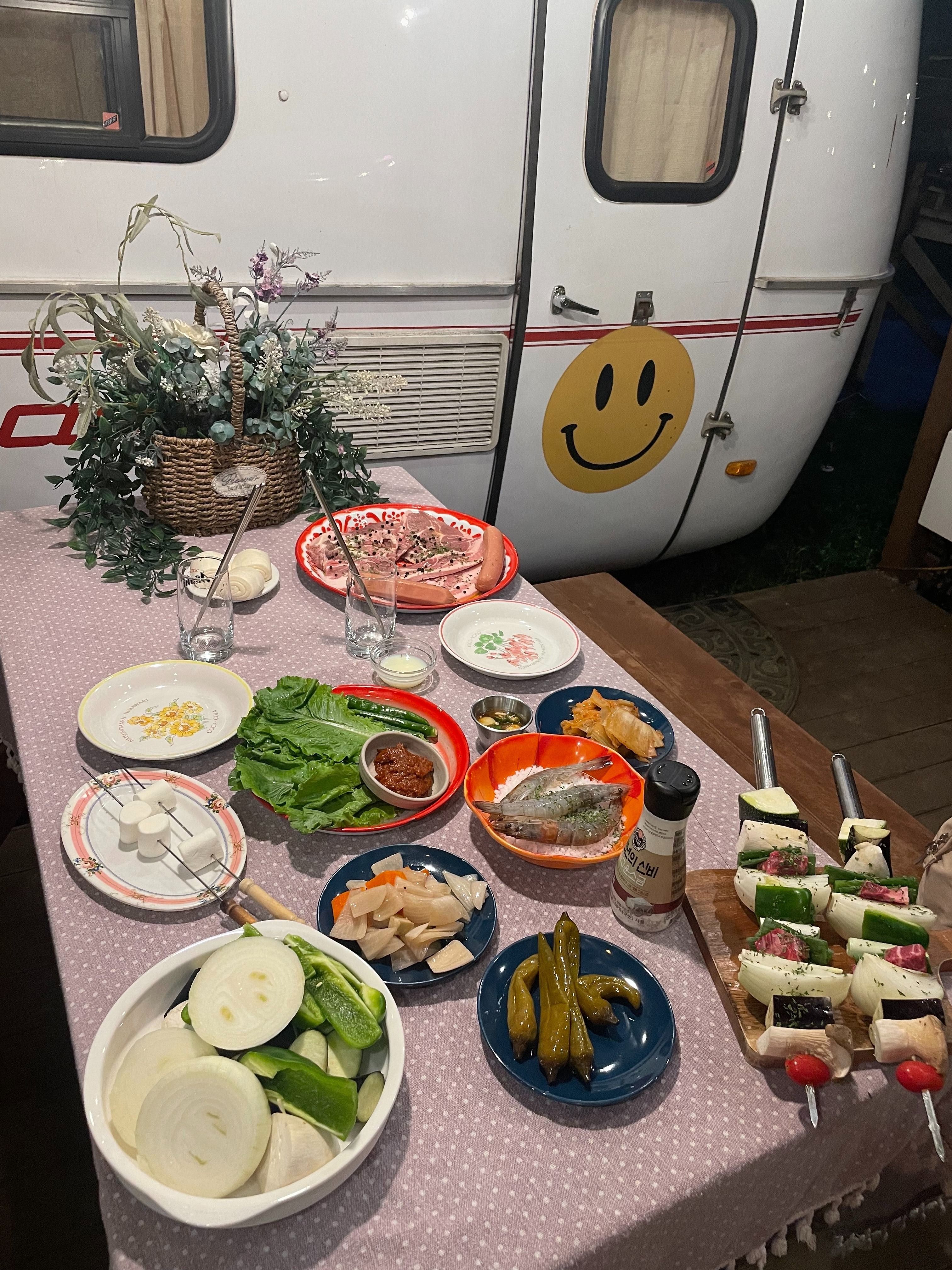남자친구랑 카라반으로 1박하고 왔어요! 글램핑에 바베큐까지 신청했더니 술이나 물 간식만 사가면 충분하더라구요ㅎㅎ 컵라면도 하나씩 준비해주셨어요! 바베큐 세트도 이쁘고 양이 많아요