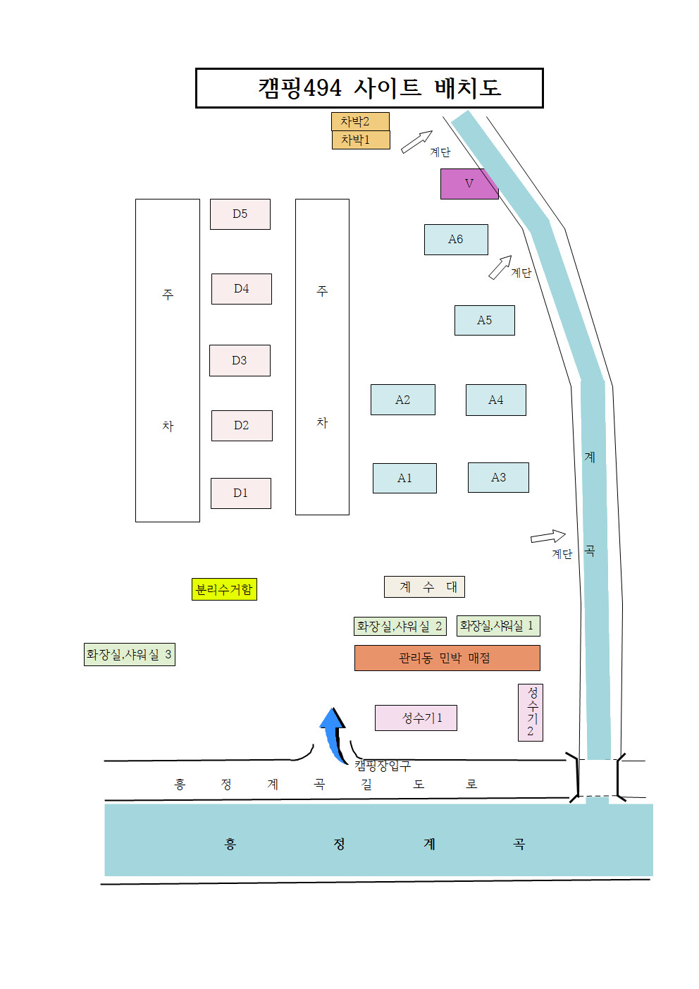 흥정계곡 상류에 위치한 캠핑 494는 강원도 평창군 봉평면에 자리 잡고 있다. 흥정산 해발 700 고지에서 발원한 맑고 깨끗한 물줄기가 흐르고 이른 아침이면 강가에 물안개가 피어 고즈넉한 곳이다. 사계절의 아름다운 자연을 즐길 수 있다. 주변 관광지로는 휘닉스파크 스키장, 허브나라 농원, 메밀꽃 축제장, 이효석 마을, 정선 아우라지, 금당계곡의 래프팅, 용평리조트, 오대산 등이 있다.