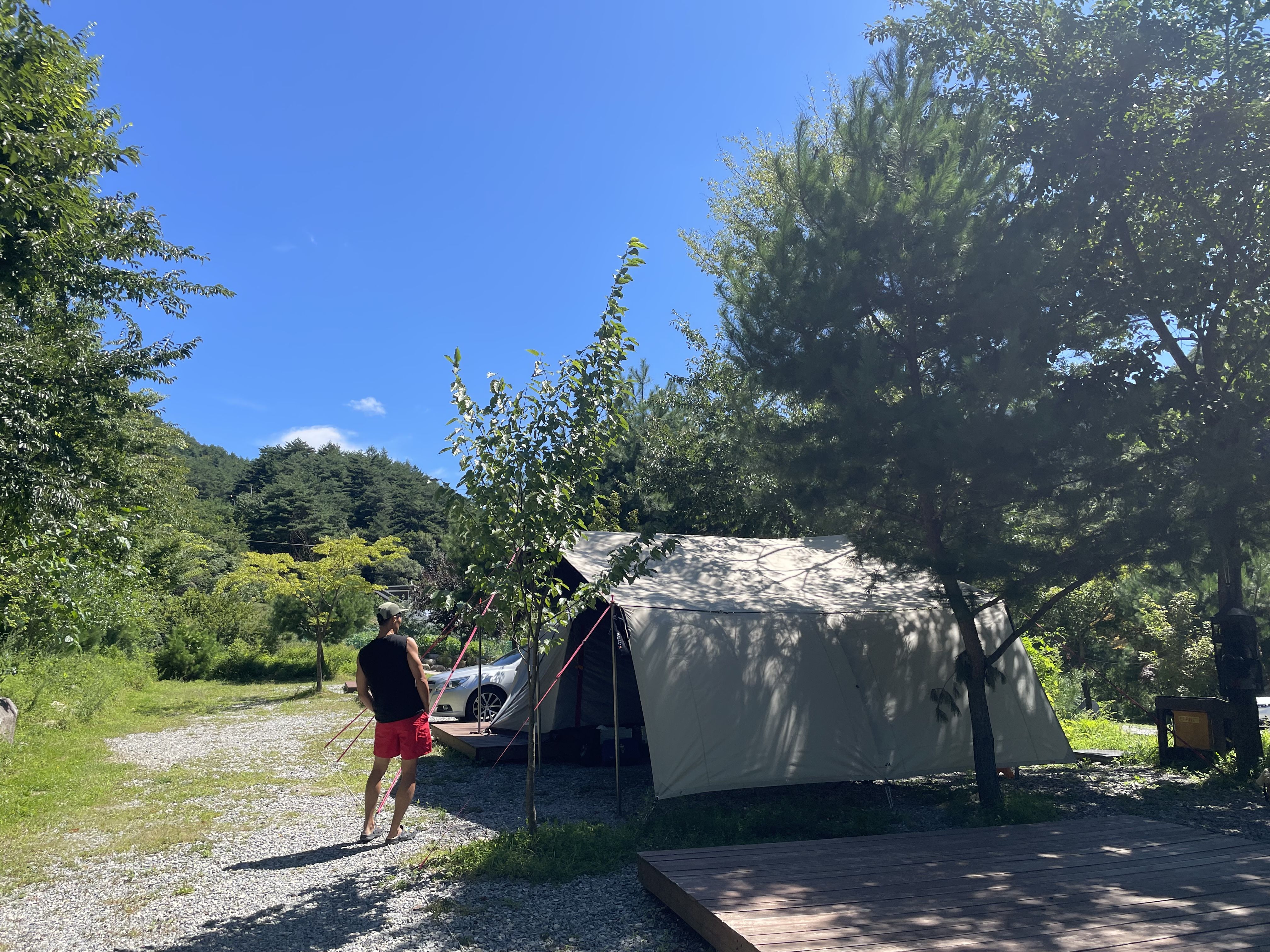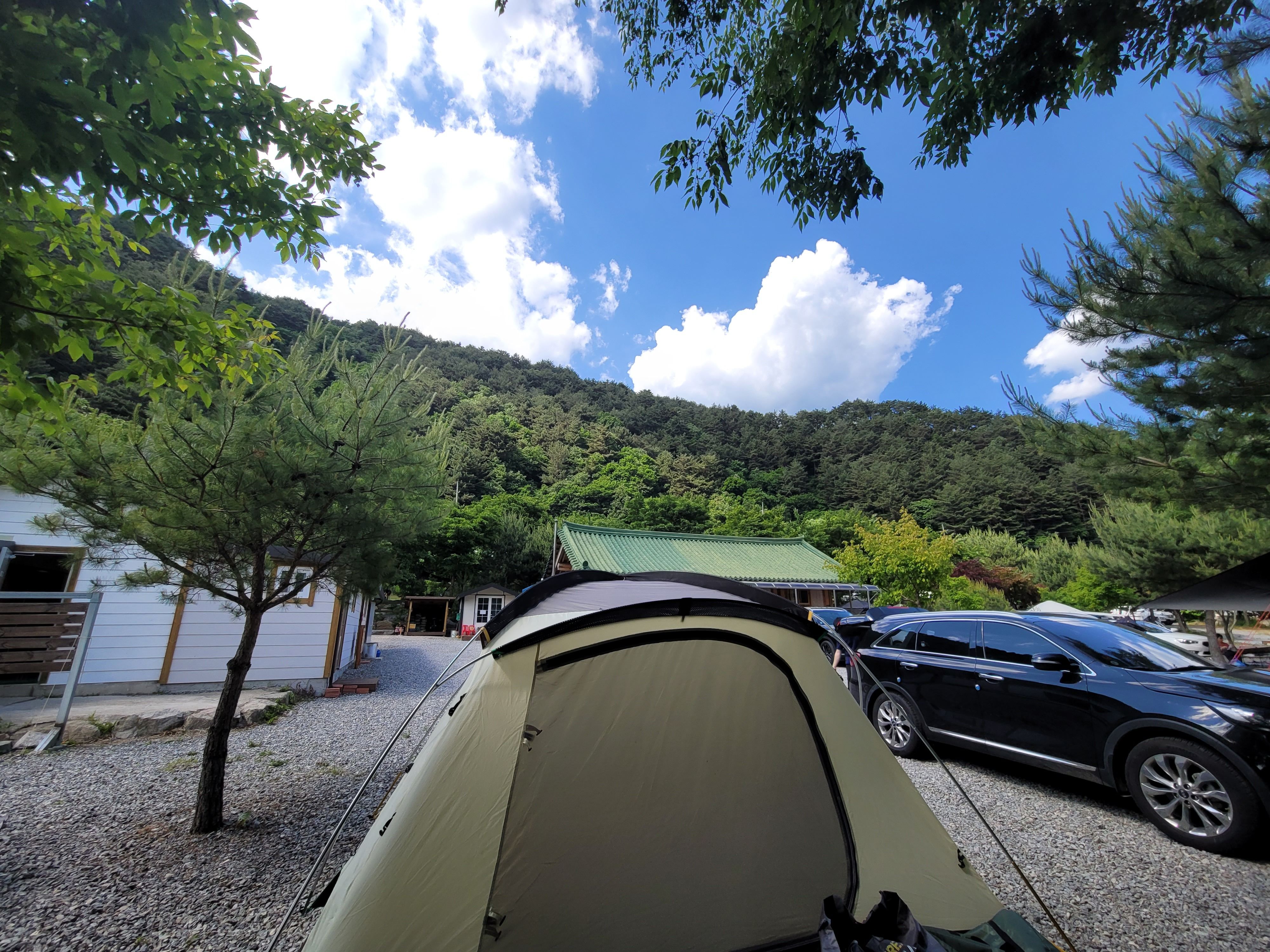 펜션하고 캠핑 함께 이용하였습니다. 펜션은 아이 둘 성인 둘 한 가족이 사용하기 딱 적당하였고 황토집인것인지 에어컨이 없이도 시원했어요! 캠핑사이트는 간격이 비교적 좁긴 했지만 불편한 정도는 아니였구요 무엇보다 사이트가 엄청 널찍해서 6x7미터 텐트 잘 치고 놀았습니당 ㅎㅎㅎ 그리고 앞 계곡이 넓고 수심이 적당하여(성인 종아리~허벅지중간) 아이들 놀기 딱 좋았어요! 산세가 좋고 물이 정말 깨끗하더라구요~ 공용시설(개수대, 화장실, 샤워실) 연식이 있긴 하지만 사장님께서 진짜 관리를 잘하시는것 같았습니다. 캠핑장 정말 많이 다녀봤는데 다시 가고 싶은 마음이 드는 몇 안되는 캠핑장 중 하나예요 ^^ 그리고 사장님이 정말 친절하십니다! 튜브도 다 대여해주시고 마주칠때마다 꼭 필요한 건 없는지 여쭤봐주시더라구요~