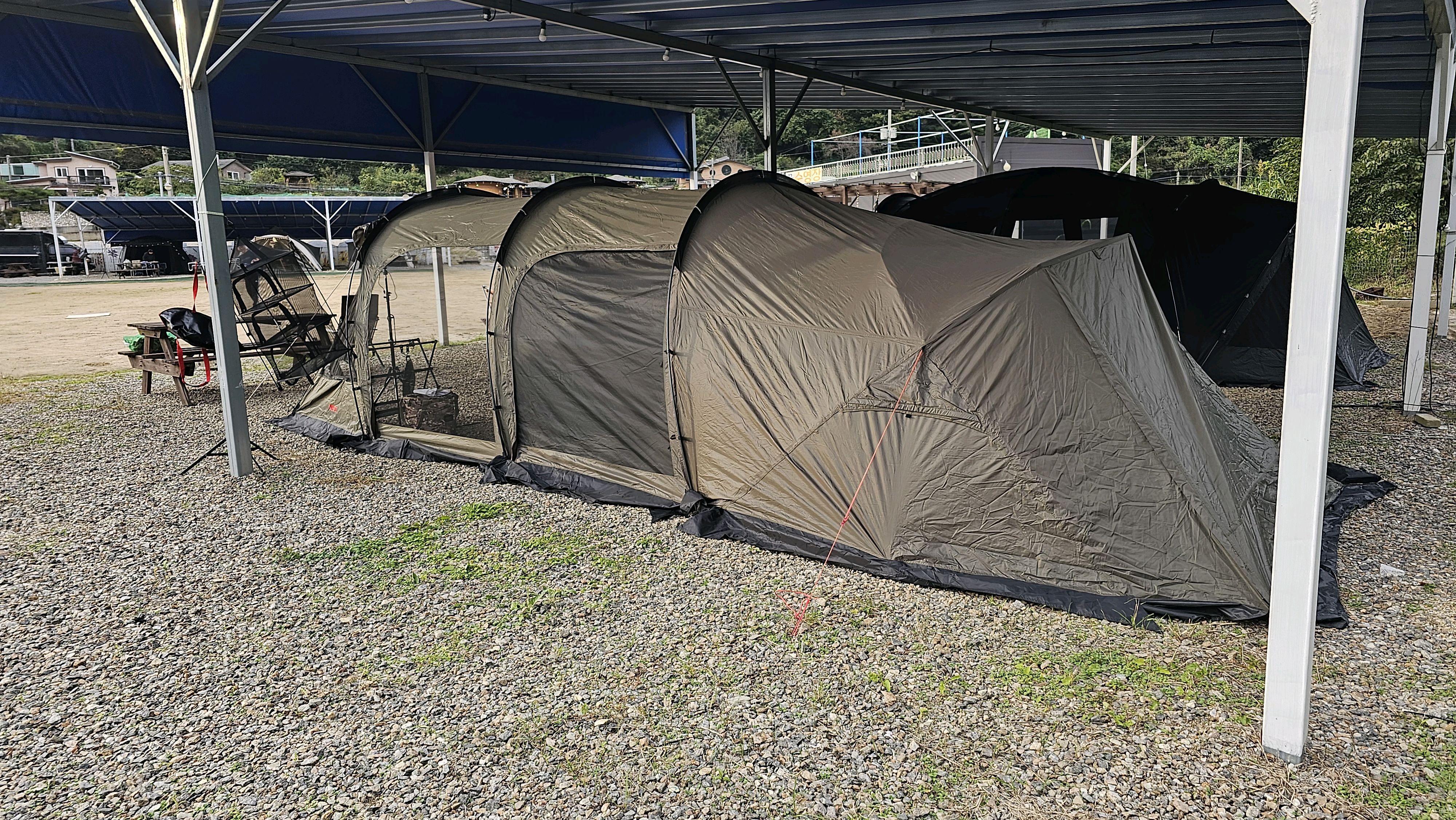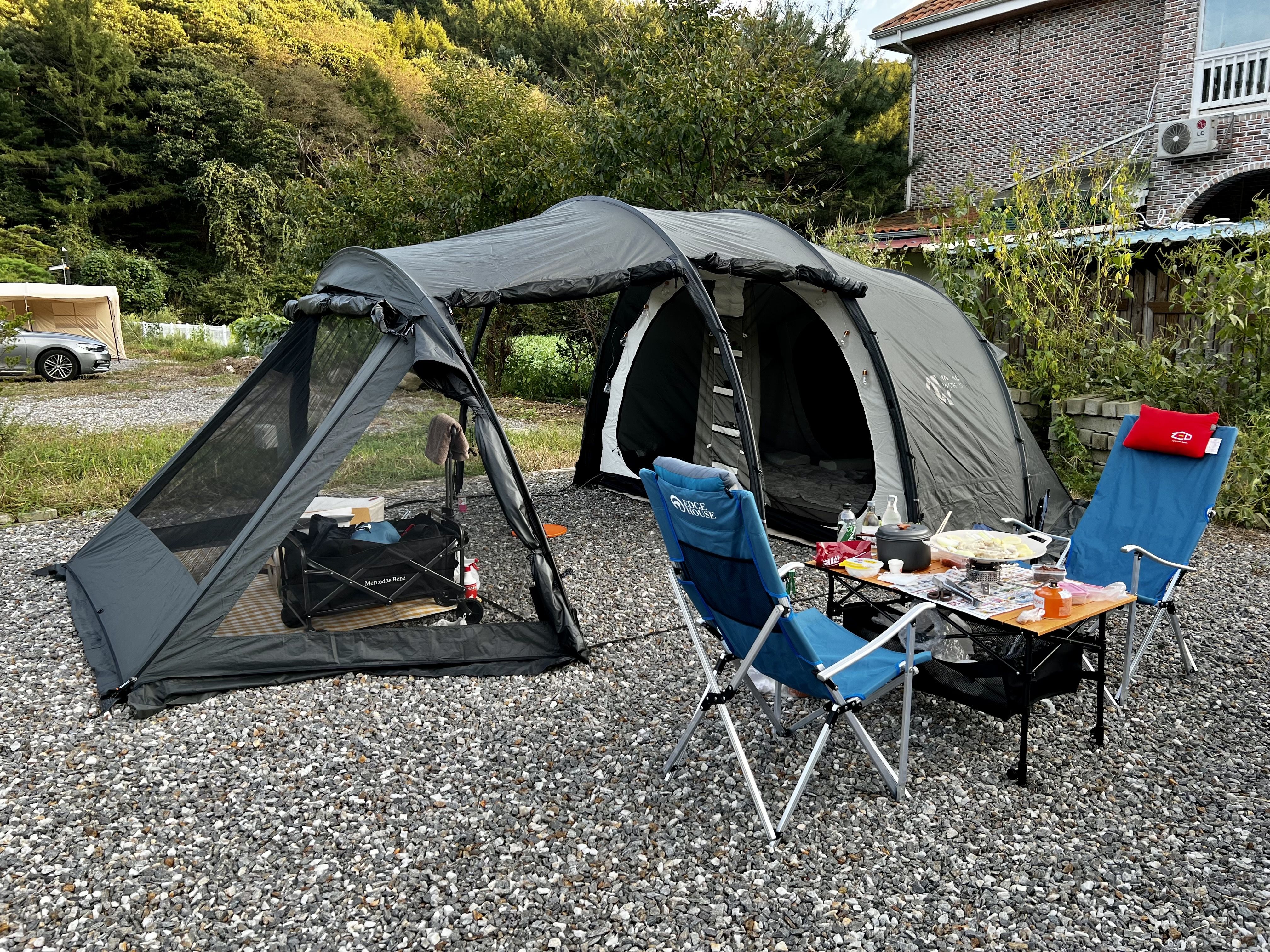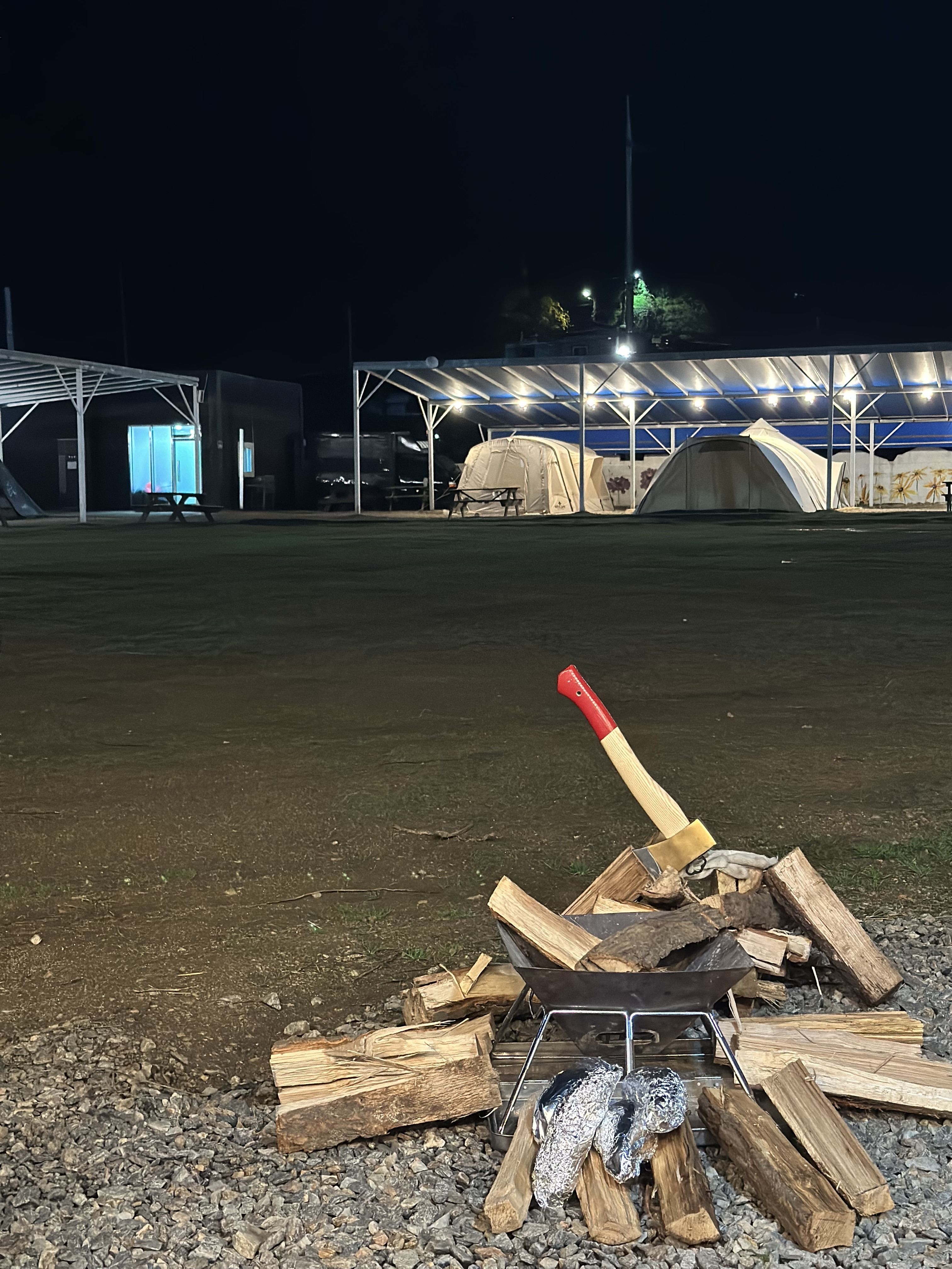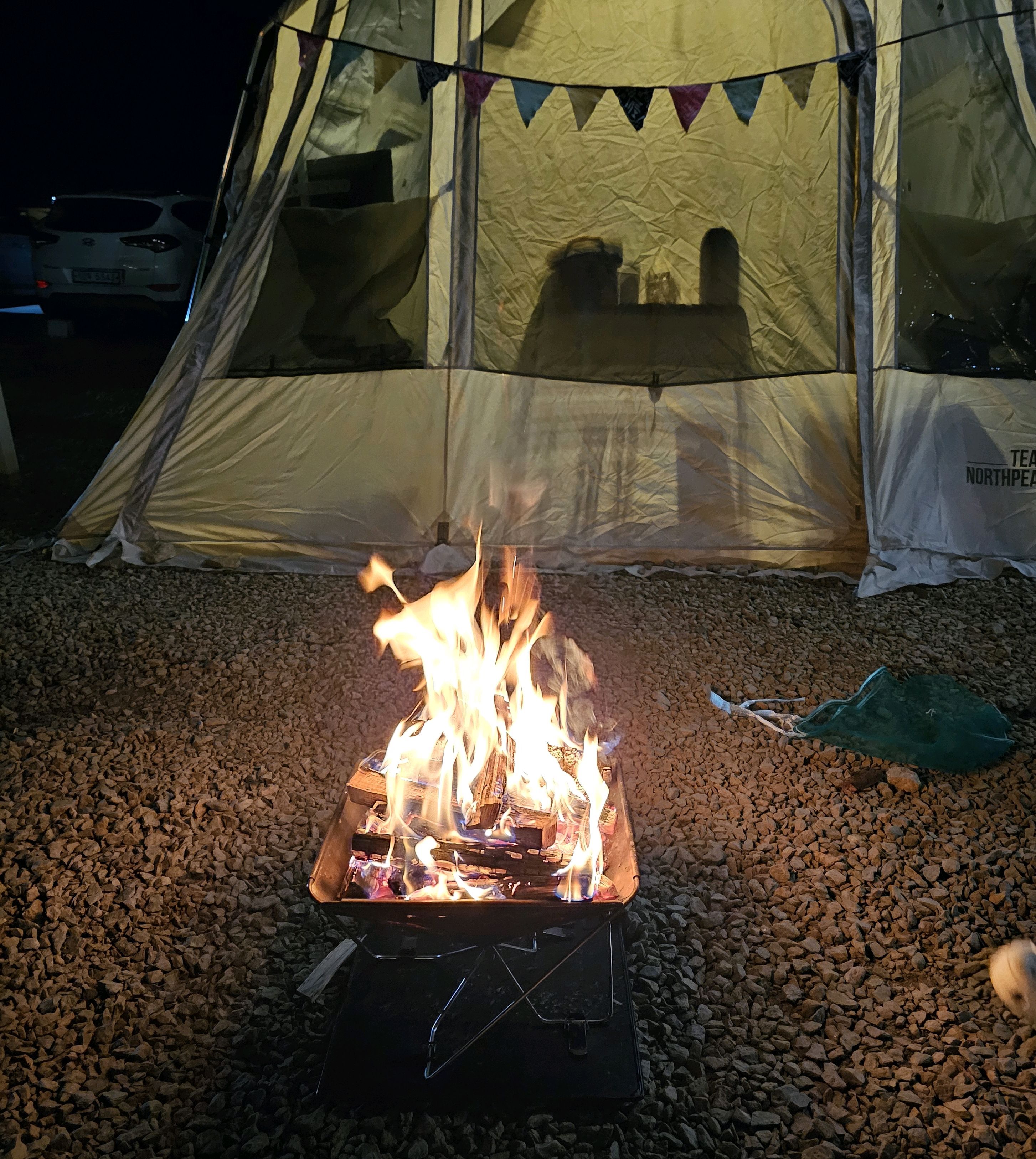 초리 사이트는 지붕이 있는 대형 사이트라, 대형 리빙쉘도 넉넉하게 피칭 가능하고, 비나 눈은 안왔지만, 날씨 영향을 적게 받아 좋을 것 같아요. 전기도 사이트별로 바로 연결 사용 가능하고, 주차도 사이트 뒤에 바로 할 수 있어 짐 옮기기 편했습니다.
