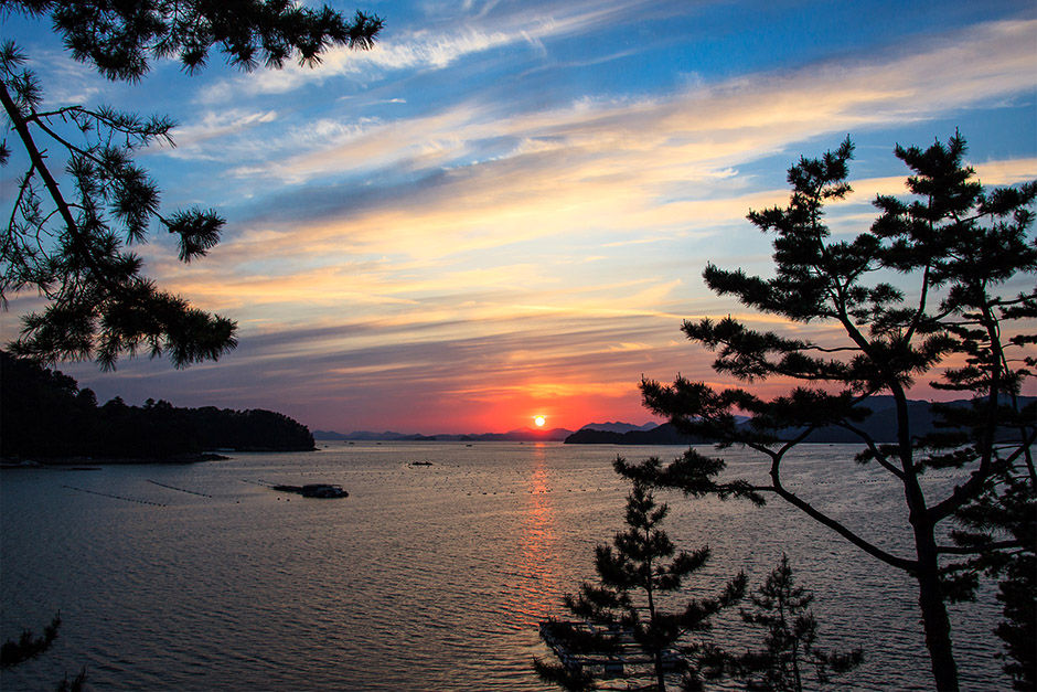 통영 평인일주로는 명정동부터 인평동까지 이어진다. 해가 산어귀를 넘어가기 전에 평인일주로 노을 전망대에 도착하면 수평선 너머로 태양이 저무는 아름다운 노을 풍경을 감상할 수 있다. 순간순간 변해 가는 바다의 색감을 카메라에 온전히 담기는 힘들어도, 눈으로 마음으로 붉은 태양이 전해주는 따스하고 영롱한 빛을 감상할 수 있는 일몰 명소이다. 주차공간도 여유롭고 곳곳에 벤치가 마련되어 있어 차 한 잔 들고 나와 일몰을 감상하기에도 좋은 곳이다.