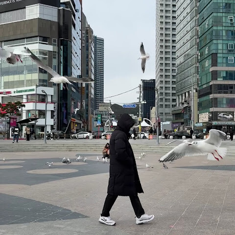 중앙 로터리 바로 옆에서 갈매기 떼가 날아다닙니다.