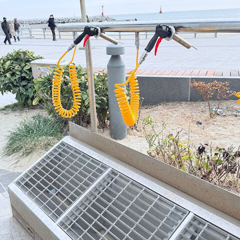 물을 분사해서 신발에 묻은 모래를 털어낼 수 있습니다! 신발이 젖을 수 있습니다.