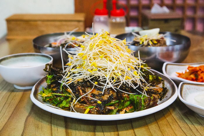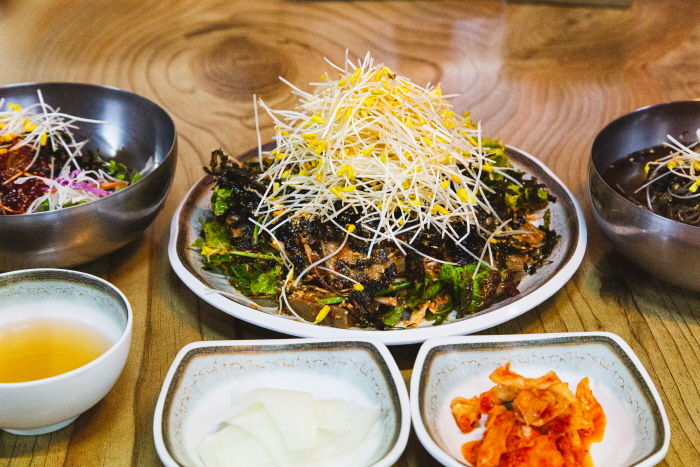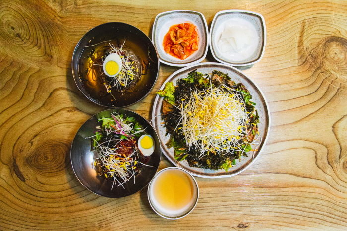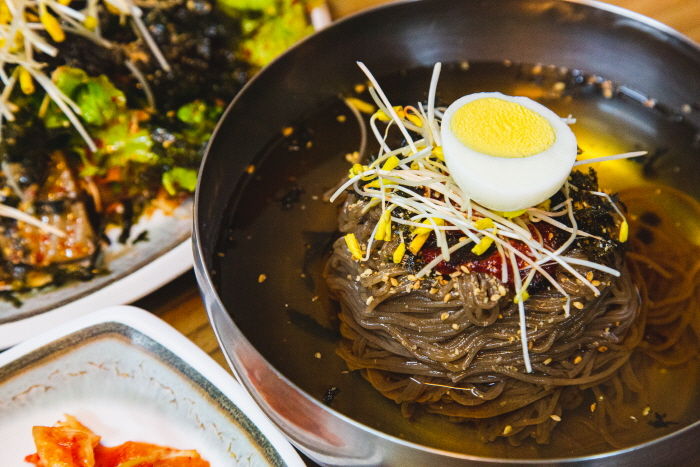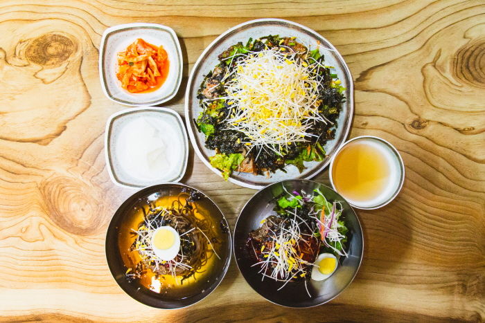 여기오시면 묵무침은 꼭 필수로 드셔야합니다 들기름이랑김듬뿍올라가서 고소한데다가 메밀묵+메밀싹이 더해진 미친맛이예요! 살짝빨간양념인데 자극적이진않구요 봉평메밀막걸리랑 같이 먹으니 너무 맛있습니다 같이 시킨 막국수랑 비빔막국수까지 맛있게 먹고갑니다💕👍👍