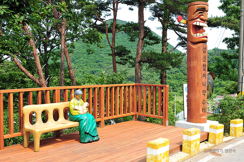 부아산으로 오르는 입구에 삼신할머니 약수터를 알리는 여장군 장승과 아기를 안고 있는 할머니 조형물이 있어 시선을 사로잡는다. 삼신할머니 약수터다. 할머니가 아기를 안고 의자에 앉아 있는 모습이 사실적으로 묘사된 이 조형물은 차도 바로 옆에 있기 때문에 발견하기 쉽다. 삼신할머니는 원래 아기와 관련이 있는 민속신앙에서 유래된 집안의 신이다. 옥황상제의 명을 받아 아이의 출산과 수명과 질병을 관장하는 신으로 예로부터 출산을 하면 가장 먼저 삼신할머니께 감사의 미역국을 끓여 올리는 풍속이 있었다. 대이작도에서 만나는 삼신할머니는 병을 고치고 소원을 이루어주는 정한수와 아기를 점지하고 보고해 주는 생명수인 약수를 내려주는 존재다. 관광객들은 부아산으로 오르기 전이나 산행 후에 이 약수를 마신다. 부아산의 정기를 받은 물이자 삼신할머니의 축복을 받은 물이라서 그런지 물맛이 다르게 느껴진다.