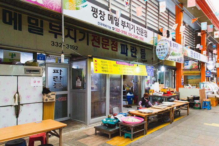 맛, 영양, 청결까지 3박자가 어우러진 시장 내 최고 부치기 집이다. 평창올림픽시장에 위치한 가장 큰 규모의 전집으로, 전 외에도 식사 메뉴를 판매하는 곳이다. 메밀칼국수, 메밀묵사발, 메밀묵무침, 메밀비빔국수가 있다. 주문 즉시 만들어주신다.
