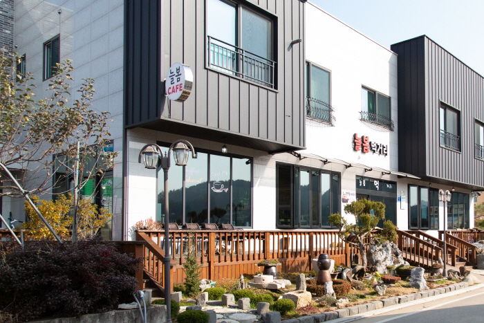 봉평면에 위치한 늘봄카페 한식당 늘봄먹거리와 함께 있는 곳으로 맷돌에 갈아먹는 특별한 커피를 맛 볼 수 있는 카페이다.