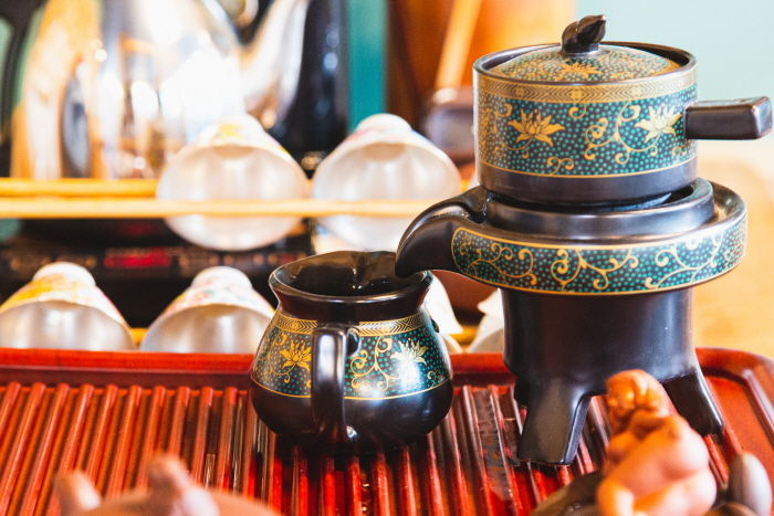 입구에 드립용 다기가 다양하게 전시되어있어 아이들이 신기해했어요.