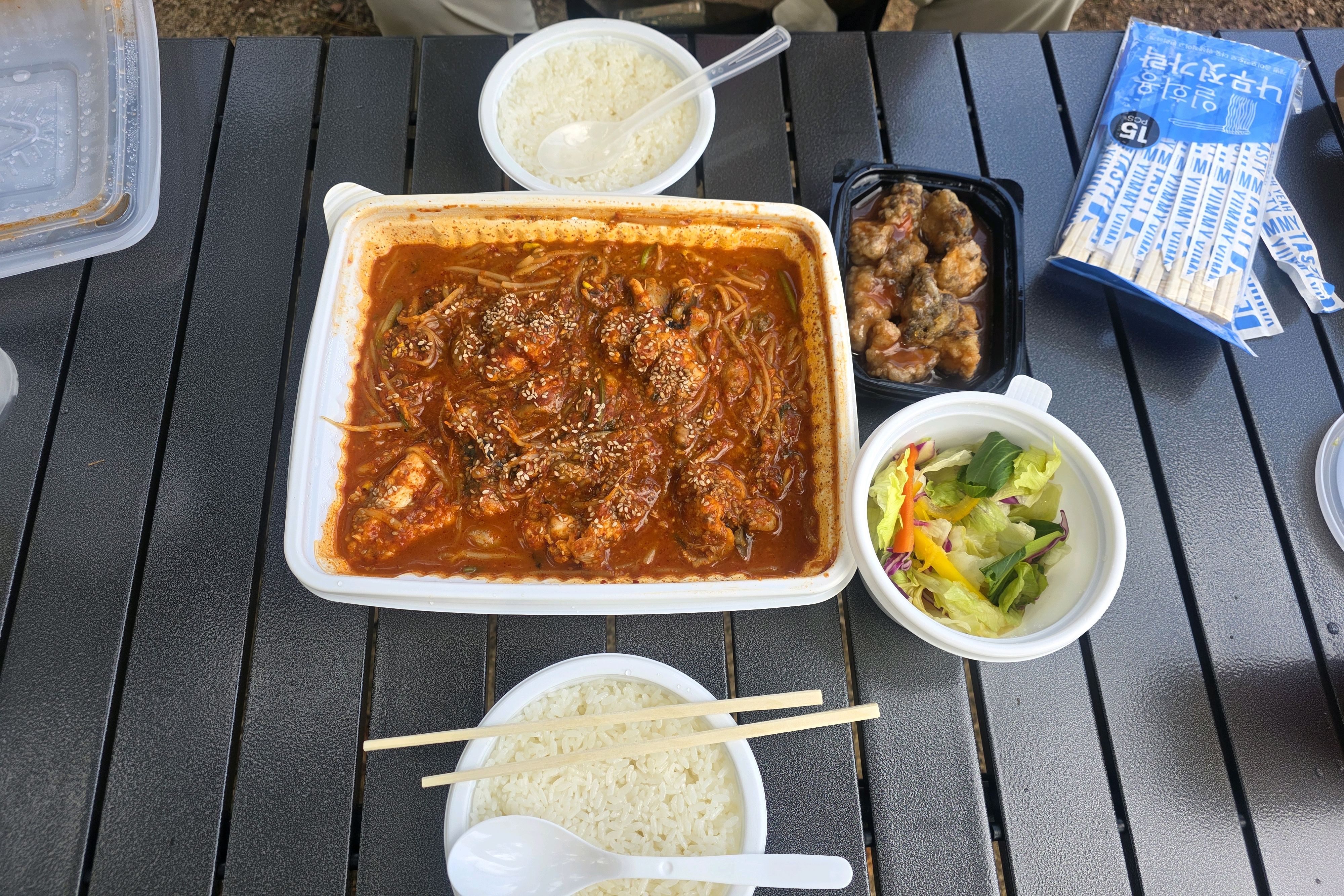 예약하고 나서 당일 비 올까봐 마음 졸였는데 아침에 출발할 땐 괜찮았어요! 자리 셋팅하고 쌀쌀해서 어묵꼬지부터 끓여 먹었는데요. 야외에서 먹는 맛이 환상 👍 👍