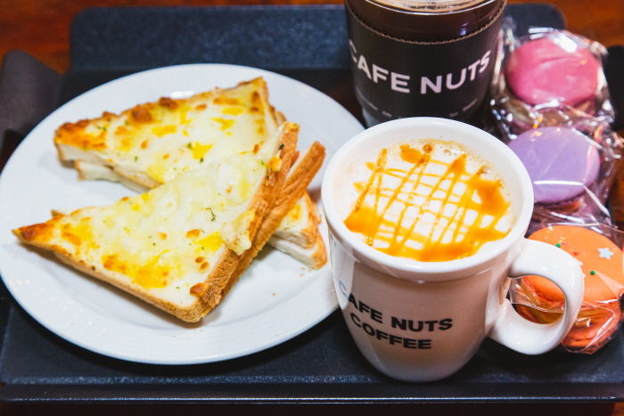 커피, 음료, 디저트(빵, 마카롱)