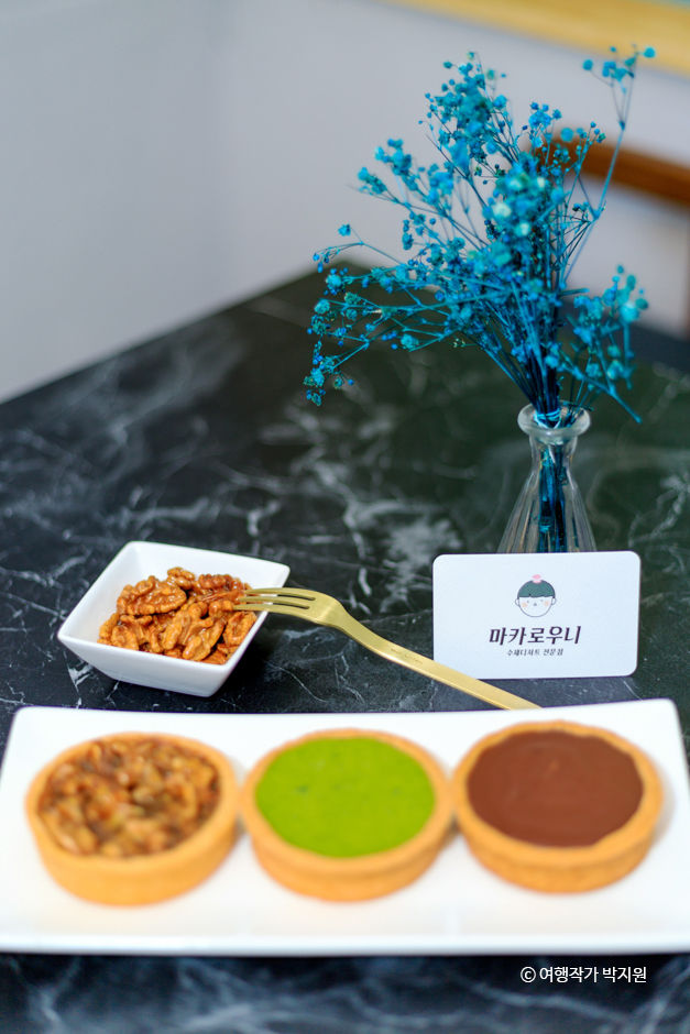 “대부분의 베이커리 카페는 디저트를 만들 때 정제된 백밀가루, 백설탕, 마가린과 같은 재료를 사용해요. 이런 재료는 아토피나 소화불량을 유발해 인체에 해롭죠.” 마카로우니 대표는 엄마다. 디저트 전문점 창업을 준비하면서 내 아이에게도 자신 있게 먹일 수 있는 건강한 디저트를 만들고자 다짐했다. 가게 문을 열고 나서도 그 각오는 변치 않았다. 마카로우니가 선보이는 글루텐프리 디저트는 여러 종류다. 대표 메뉴는 타르트다. 가나슈 초코와 제주말차 타르트는 가나슈 필링을 채워 얼려서 먹으면 더욱 맛있다. 얼린 상태에서 먹어도 딱딱하지 않고 꾸덕꾸덕한 식감이 최고다. 호두 타르트는 대중적인 입맛에 맞추고자 계핏가루를 넣지 않았다. 올리고당, 무스코바도, 메이플 시럽 등을 넣어 맛과 향이 깊다. 재구매가 가장 많은 디저트는 호두강정이다. 끓는 물에 전처리한 호두에 시럽을 입혀서 오븐에 굽는데, 호두 특유의 쓴맛을 잡고 고소함을 극대화했다.