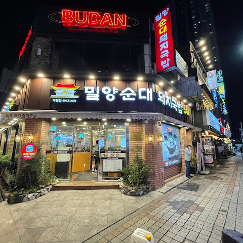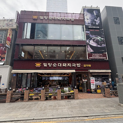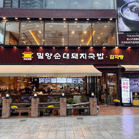 24시간 연중무휴로 운영되는 밀양순대돼지국밥은 14년여를 오로지 돼지국밥만 연구해 온 맛집이다. 순수 국내산 돼지뼈 사골을 48시간 이상 고아 낸 진하고 뽀얀 국물에 고기와 파를 넣어 뚝배기에 나오는데, 국물 맛이 깔끔하고 담백하다. 미리 나온 부추와 소면을 넣고 새우젓과 양념장을 풀어 넣어 밥과 함께 먹으면 배 속이 든든해진다. 국밥 안에 들어 있는 쫀득하게 씹히는 고기는 잡내 없이 깨끗한 맛이라 처음 돼지국밥을 접하는 사람도 거부감 없이 즐길 수 있다. 돼지국밥 외에도 순대국밥, 섞어국밥, 내장국밥, 모둠국밥 등 입맛에 따라 선택하여 주문할 수 있으며, 감자탕, 뼈해장국도 진한 맛이 일품이다.