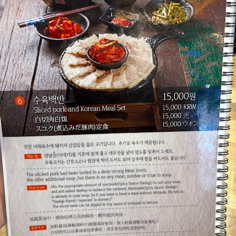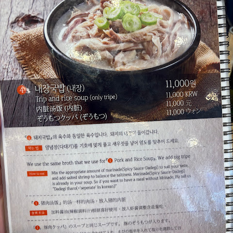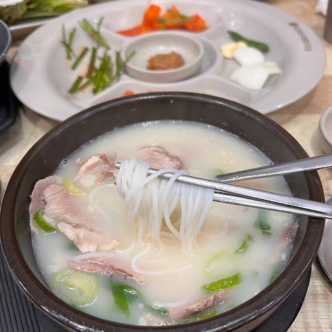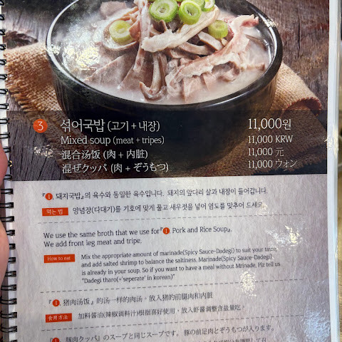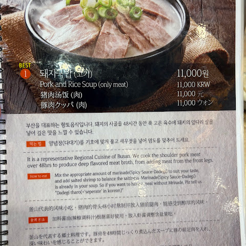 이 식당은 한국에 지점이 여러 개 있습니다. 돼지국밥은 정말 맛있습니다. 새우장, 소금, 후추를 더하면 국물이 더욱 깊어집니다. 삼겹살만 주문하면 좀 오래돼서 조금 실망스럽습니다.