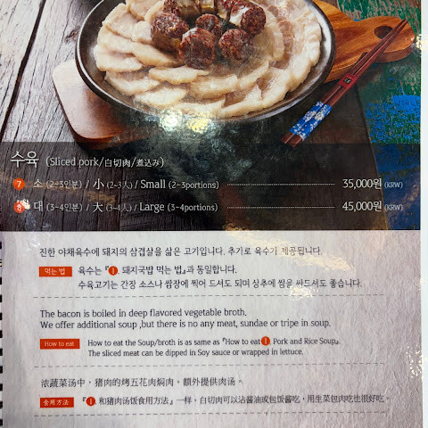 깔끔한 삼겹살(11,000원)은 대만식 삼겹살처럼 육즙이 풍부하고 맛있지는 않고, 순대(11,000원) 한 접시 먹는 게 익숙하지 않아서요. 순대와 삼겹살 국밥(11,000원)은 괜찮은 편이에요.