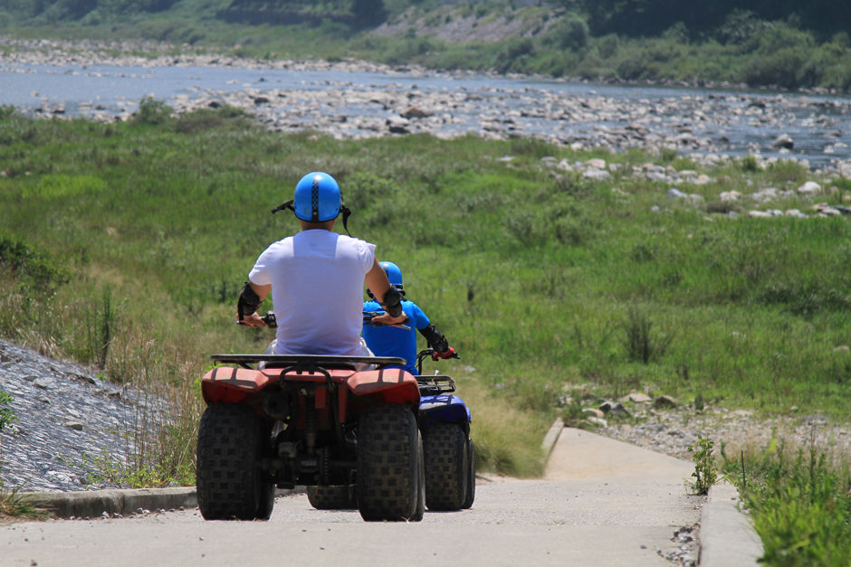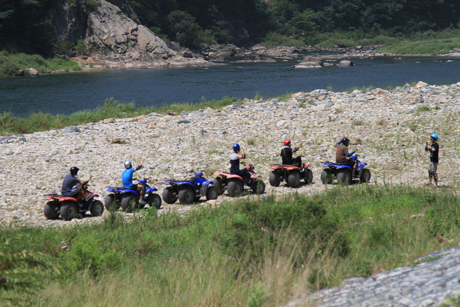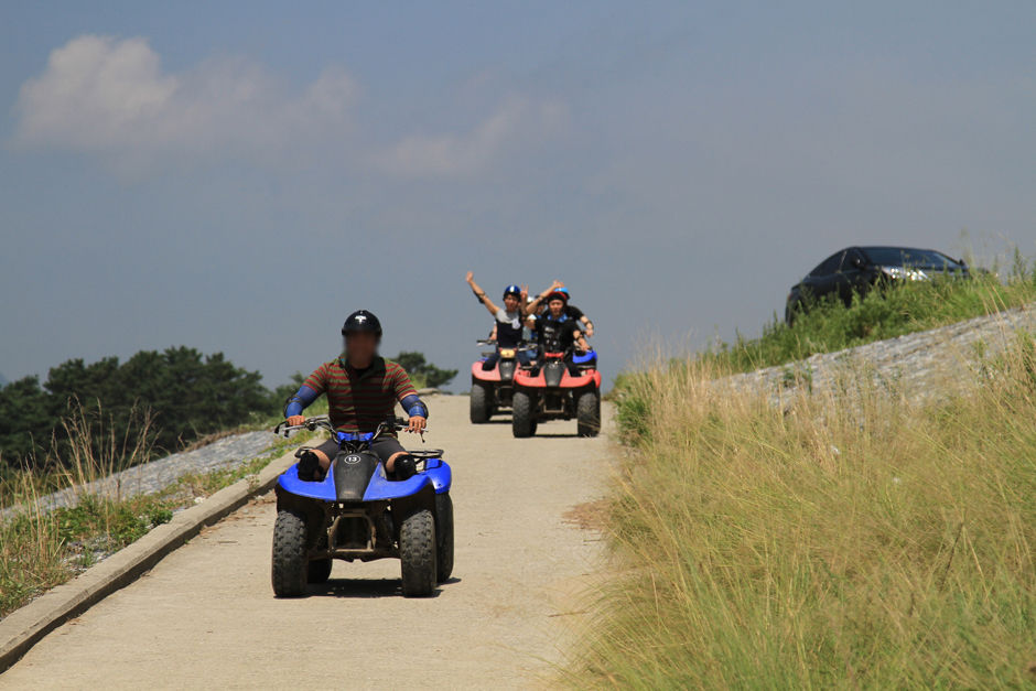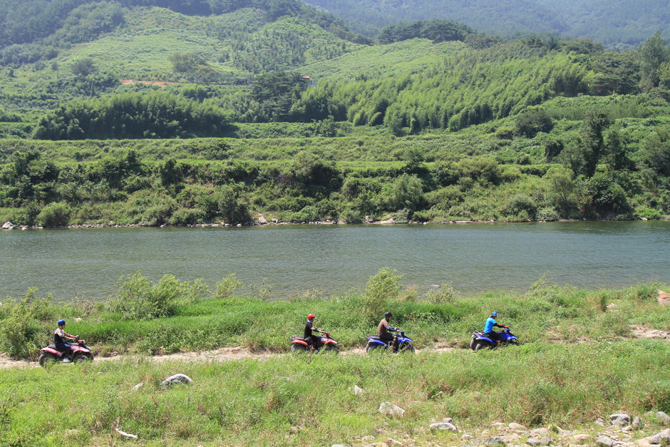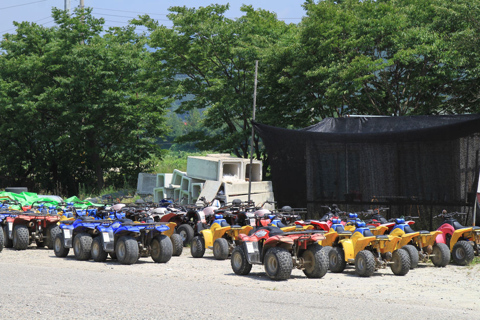 ATV란 ‘어떤 지형에서든 주행이 가능한 탈 것(All-Terrain Vehicle)’이란 말의 영문 머리글자를 조합해 만든 용어로, 길이 없는 오프로드(off road)에서도 주행할 수 있는 사륜 차를 말한다. 그렇지만 조향장치, 조작 방식, 동력 전달 방식 등은 오토바이와 흡사하다. 산청에는 AT 장이 세 곳 있다. 그중 가장 규모가 크고 오프 로드의 재미가 큰 곳이 옛 경호강 휴게소에 자리 잡은 엑스로드 ATV 장이다. 지금은 영업하지 않는 휴게소가 전부 오프로드 연습장이다. 휴게소 마당에서 충분히 연습한 다음에는 강변으로 내려간다. 경호강을 따라 신나게 달리다 보면 온갖 시름이 달아난다.