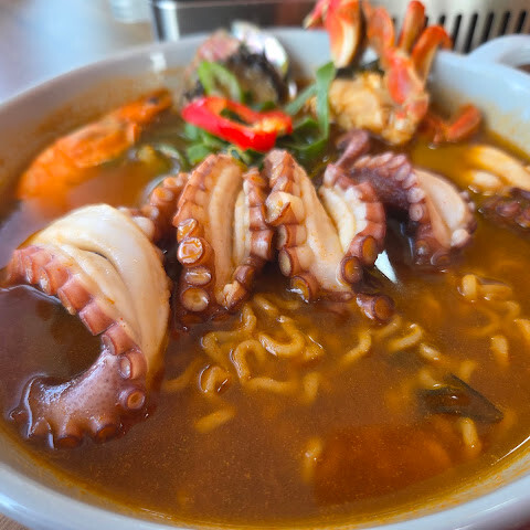 귀여운 문어가 길을 반겨준다 라면 칼국수를 시켰는데 재미나게 해물을 먼저 건저먹고 나중에 칼국수와 라면사리를 넣고 먹는다