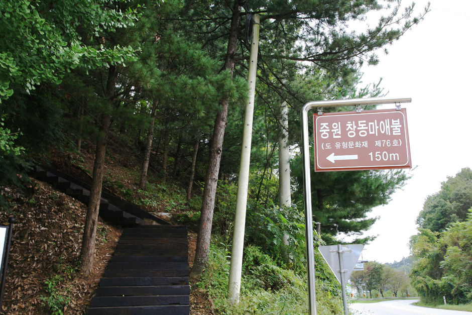 충주 시내에서 탄금대를 지나 창동 5층 석탑 부근에 있는 마애불이다. 남한강을 굽어보는 거대한 암벽에 조각된 것으로 높이는 4m 이상이다. 머리와 얼굴 부위는 튀어나오게 양각하였고, 그 이하의 신체는 음각선으로 새겼다. 머리는 소발이며 풍만한 얼굴에 코도 큼직하게 표현하였다. 강 부근에 새겨둔 걸로 보아 고려 시대부터 조창지였던 가흥창과 관련하여 뱃길의 안전을 기원하기 위해 만든 것으로 추정된다.