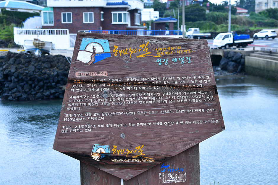 제주시 애월읍에 자리한 고내 포구는 에메랄드빛 제주 바다를 감상할 수 있는 애월읍 해안도로를 따라 달리다 보면 지나게 되는 작은 포구이다. 여유롭고 고즈넉한 어촌 마을의 분위기가 가득한 이곳은 맑고 깨끗한 바다와 올레길 16코스로 인해 관광객이 많이 찾는 곳이다. 바다를 향해 길게 나 있는 방파제에는 사진을 찍으려는 사람들은 물론, 의자를 펴고 취미 낚시를 즐기는 사람을 종종 볼 수 있다. 물이 워낙 맑아서 바다를 들여다보면 물고기가 돌아다니는 모습이 직접 보일 정도다. 제주 올레길 16코스의 시작이자 15코스의 종점이기도 하다.