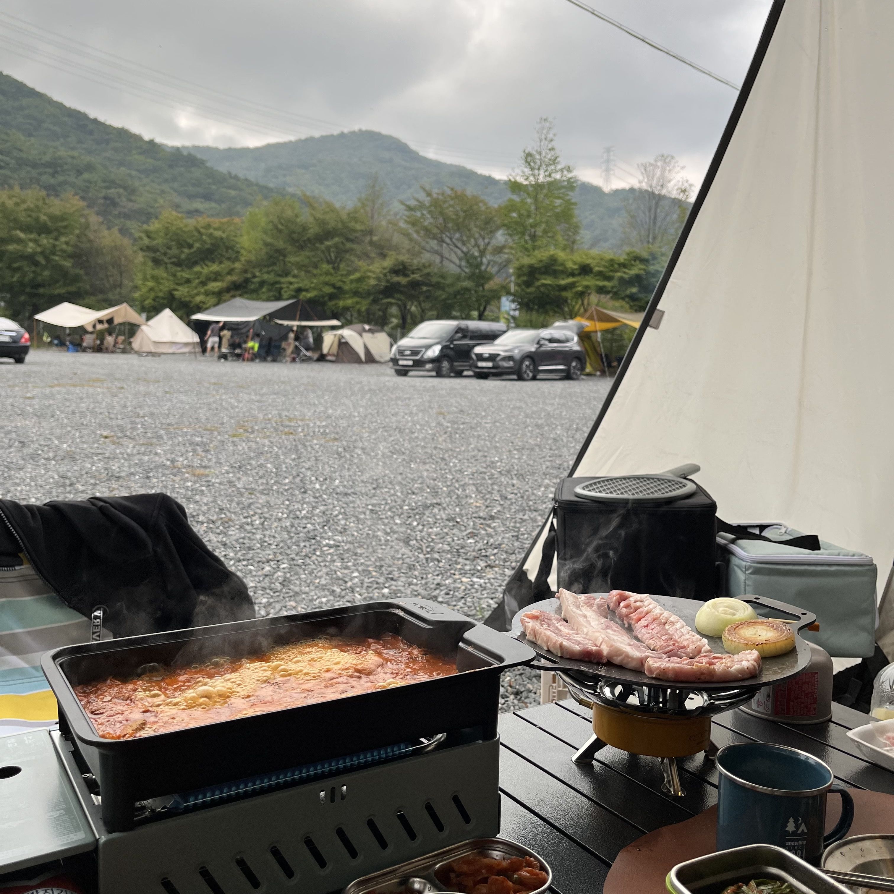 예약할땐 몰랐는데 바로앞에 카라반이 있어서 좋은 뷰는 아니였어요 카라반쪽 텐트사이트는 온수나오는 개수대도 거리가 있고 화장실도 살짝 거리가 있어요 수련원 방을 쓸수 있어서 온수랑 샤워는 편했는데 나머지는 조금 아쉽네요 🥲