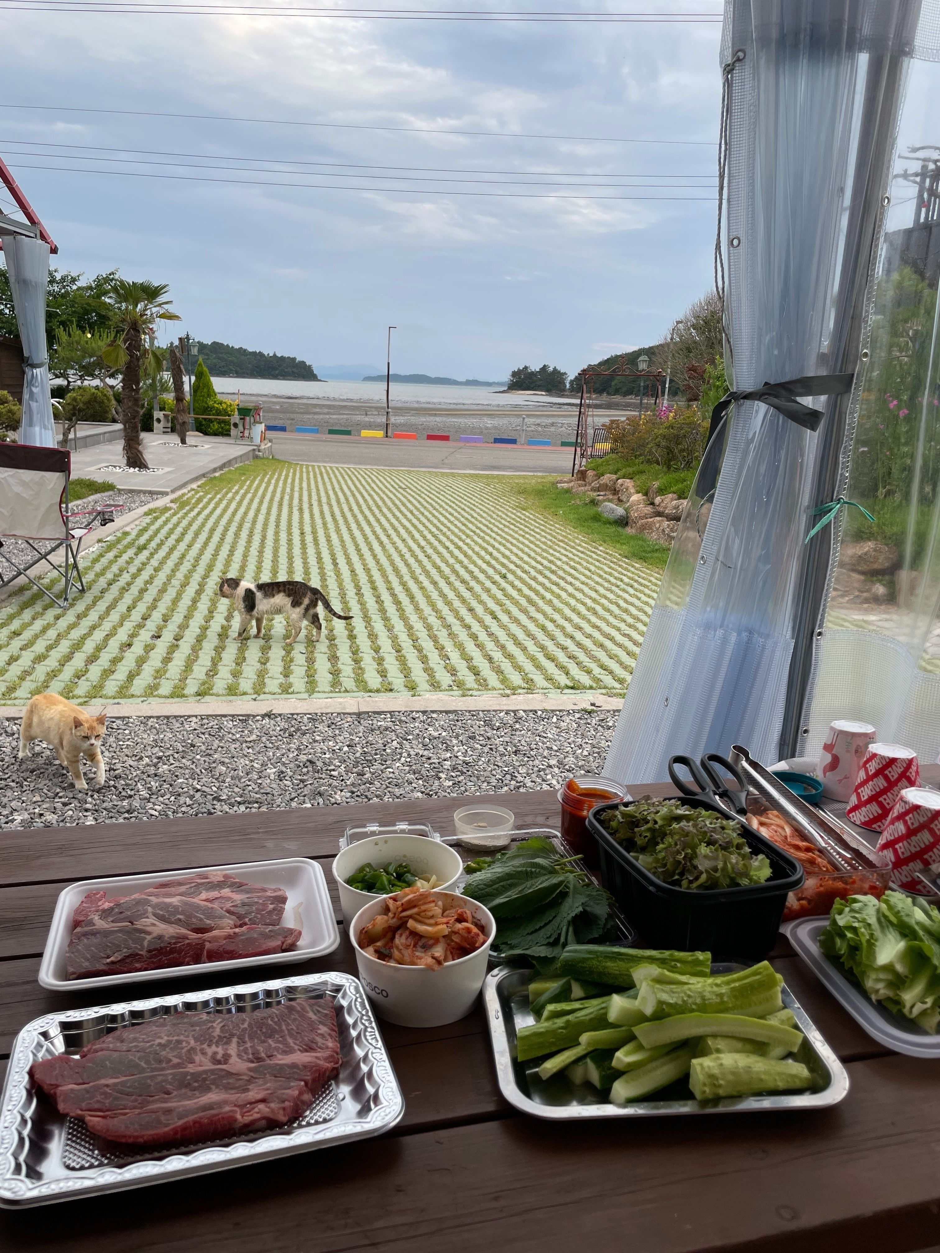 글램핑장을 처음 이용해봤는데 진짜 너무 좋더라구요. 바로 앞이 바다라 더 좋았던것같아요! 엄마랑 남편이랑 셋이서 방문했어요♡ 짐 풀고있는데 사장님이 친절하게 웃으시면서 홍시를 주시더라구요! 진짜 너무 잘먹었습니당ㅎㅎ친절하신만큼 숙소내부 먼지하나없을정도로 깨끗했고 화장실은 작긴했지만 칫솔,샴푸,바디워시 등 있을거 다 있더라구요~ tv밑 서랍장에 깨끗한수건도 잔뜩 있었어요. 진짜 깜짝놀랐던건 침대가 너무 푹신푹신했어요! 대만족! 바베큐는 30분전에 미리 말씀드려서 준비했는데ㅎㅎ이놈의 아깽이들이 하루종일 붙어서 감시하더라구요. 저랑 남편은 워낙 고양이를 좋아해서 행복했지만 동물을 별로 안좋아하시는 엄마는 비명 엄청 지르셨다는...ㅋㅋ고양이들 좀 많으니까 참고하시고 방문하셔요ㅎ