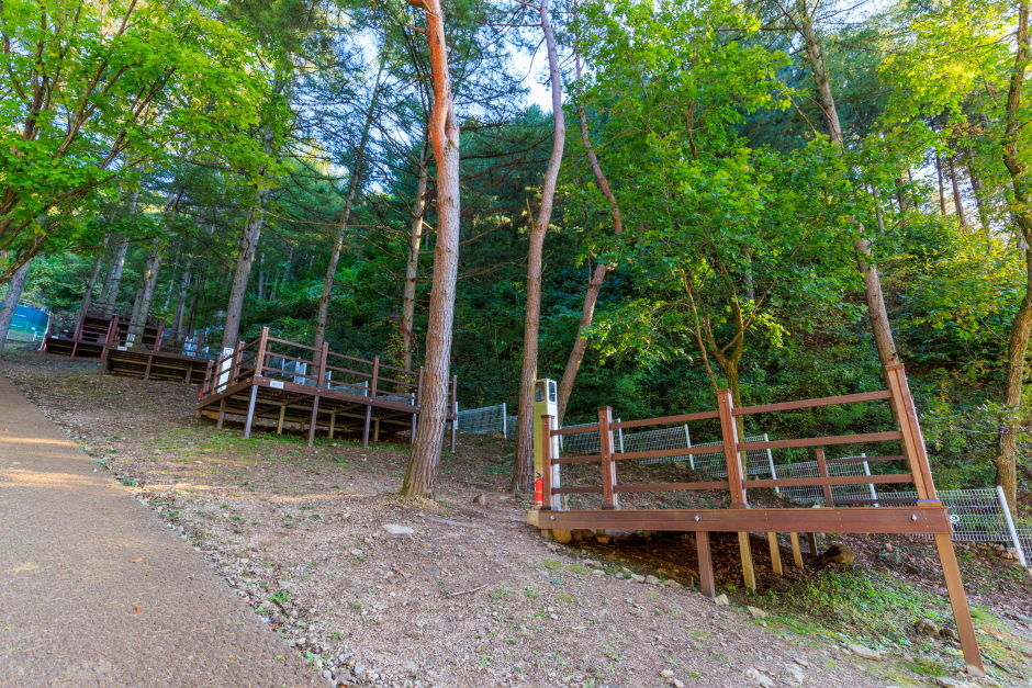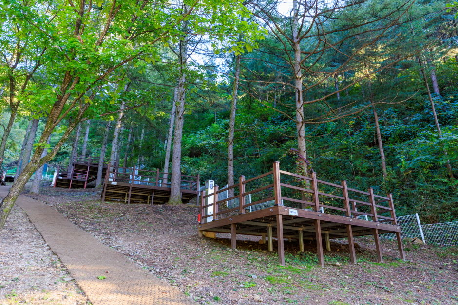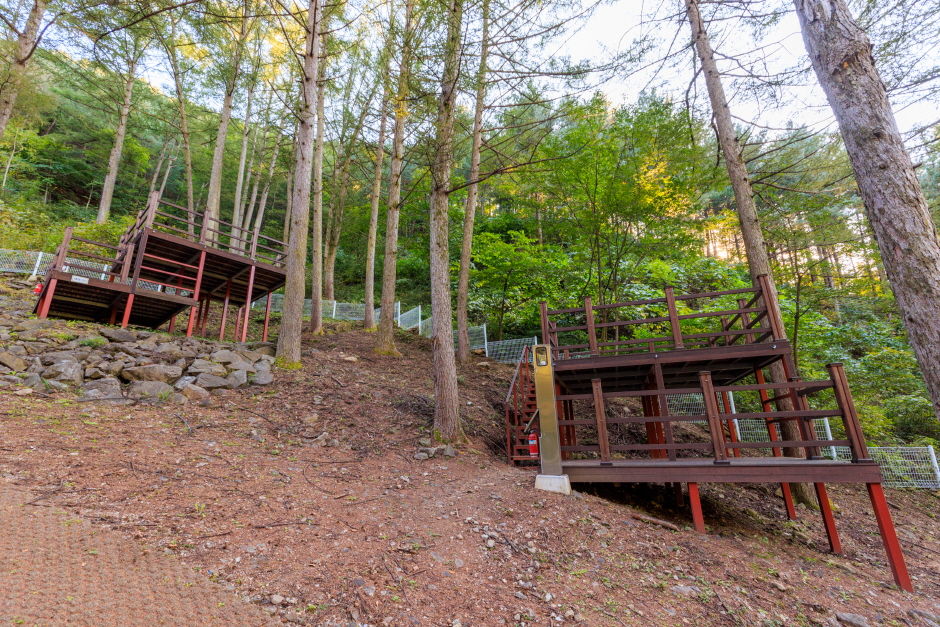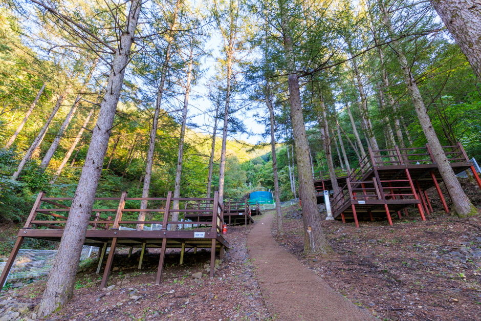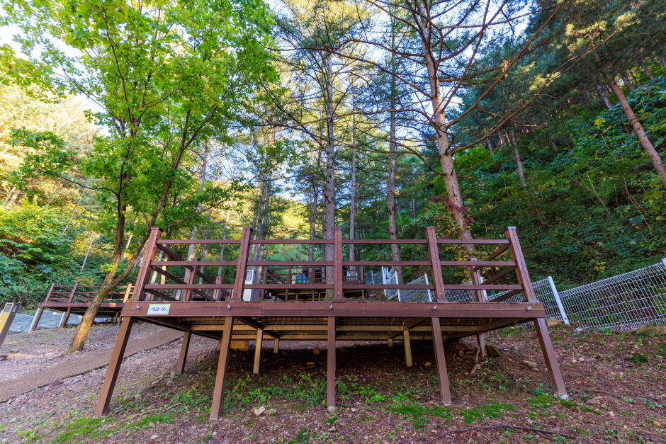 캠핑장에는 데크로 이루어진 일반 캠핑 사이트 12면이 마련되어 있다. 우거진 수목 사이에 사이트가 위치해 한여름에도 자연 그늘이 만들어진다. 자연휴양림이기 때문에 화로 사용 등 야영장 내에서 불을 피우는 것은 금지다. 단, 캠핑장 앞에 바비큐장이 있어 불편하지 않다. 캠핑장 주변에는 국립백두대간 수목원, 다덕약수관광지가 있어 연계 여행에 나서기 수월하다. |