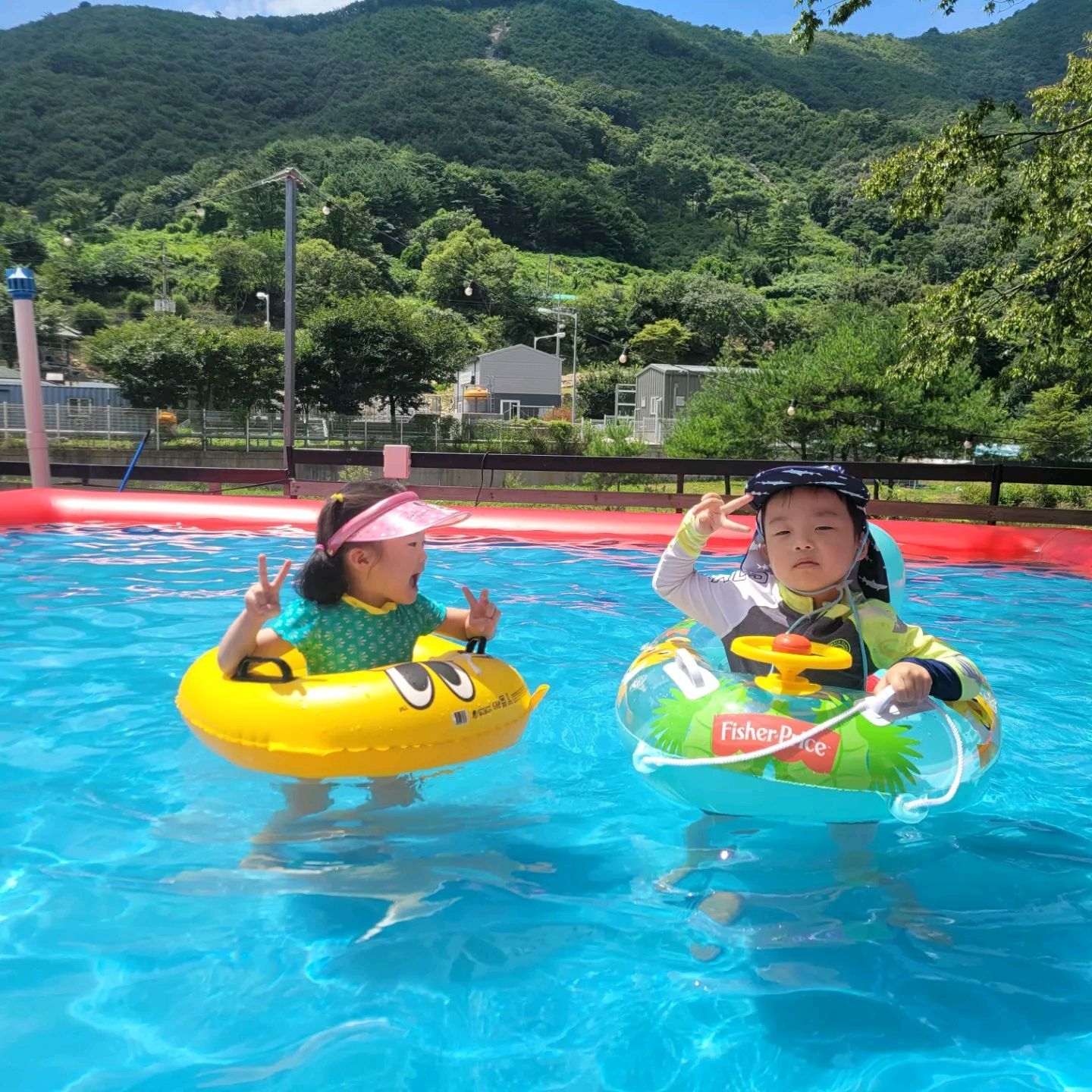 글램핑 내부 넘좋아요 욕실화장실 침구청결상태. 드라이기. 일회용품과수건구비. 개수대공간 냉장고넉넉. 식탁. 바깥이동가능한 테이블과 네개의 접이식의자까지 넘 완벽!!! 약간아쉬운건 계곡물이 적어서 아쉽고 수영장이 사진처럼 헌데 7세이하유아있으시면 안전하고 놀기넘 좋아요!! 재방문의사있어요 물놀이의 아쉬움이 있어서 봄,가을에 오면 특히 글램핑옆뒤로 큰나무많아서 운치있어요. 벚나무!! 봄에오면 예쁠것같고 가을단풍도 좋을것같아요~ 또하나 농구공, 배드민턴챙겨와서 놀면 좋을것같아요. 담엔 민턴채공,공 챙거오려구ㅛ^^