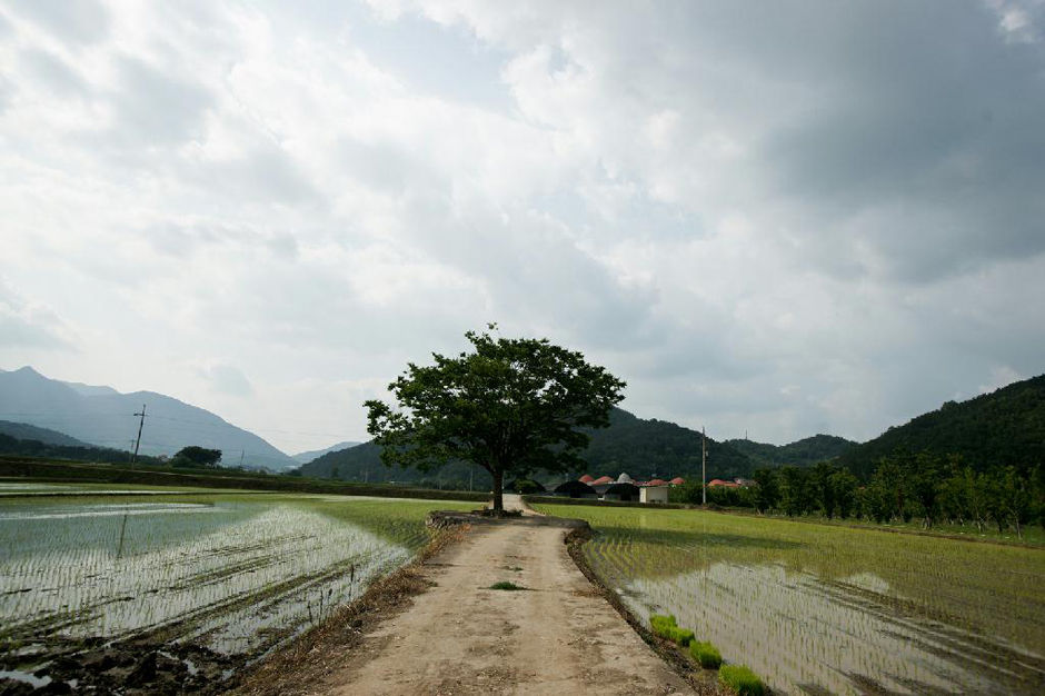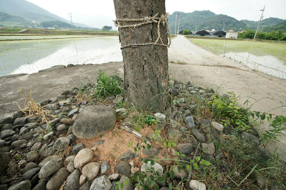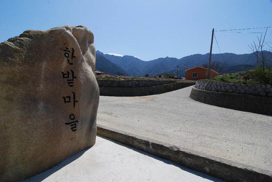 ‘한밭’은 광활한 넓은 밭을 이르는 말이지만. 깊고 높은 지리산 자락과 제법 넓은 경호강 줄기를 끼고 살아온 마을인지라 작은 시골 마을이지만 ‘한밭’이라는 이름이 붙었다. 한밭마을의 당산은 두 군데가 있다. 마을 입구의 ‘할배당산’과 마을 안쪽 논 한복판에 ‘할매당산’이 있다. 할매당산이 쓰러지기 전까지는 그 높이가 3m에 달했다고 한다. 마을이 풍수지리적으로 ‘배설’의 형국인 탓에 강물이 자주 범람하여 수해를 입는데, 마을 곳곳에 있는 큰 바위들은 오래전 누군가 마을이 물에 떠내려가지 않기 위해 북두칠성의 형상으로 바위를 가져다 놓았다는 설이 있다.