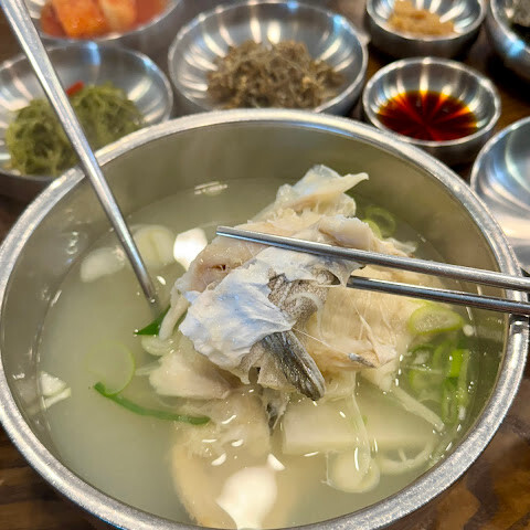 국물은 진하고, 생선은 부드럽고, 밑반찬도 맛있어요.