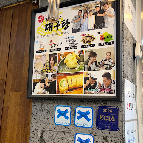 안으로 들어서자마자 벽면을 가득 채운 유명인들의 사인에 깜짝 놀랐습니다! 런닝맨의 하하도 방문했었더라고요! 이 소박한 대구탕이 블루리본상 후보에까지 올랐다니!