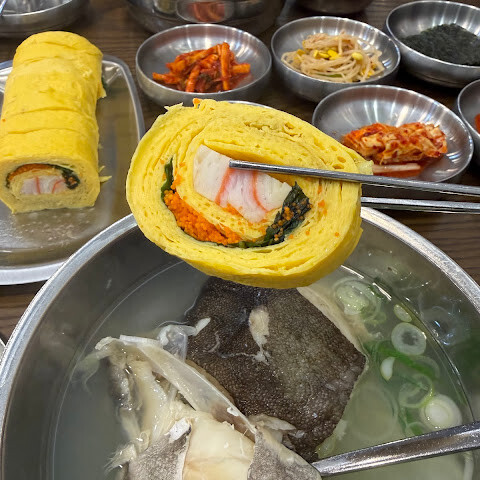 설탕처럼 하얀 생선탕은 생선살이 아주 부드럽고 뼈가 없어 먹기 편했습니다. 건강하고 맛있는 곳을 또 하나 찾았네요! 생선 단백질 함량도 엄청 높았습니다. 옆 테이블에서 게살과 계란말이를 시켰는데 맛있어 보여서 저희도 하나 시켰습니다. 양이 엄청 많았어요! 10,000원이 전혀 비싸게 느껴지지 않았습니다. 안에는 게살, 생선알, 깻잎이 들어 있었는데, 이 독창적인 조합이 정말 환상적이었습니다! 이곳은 부산에서 유명하고 오랜 역사를 자랑하는 맛집으로, 많은 연예인들이 찾는 곳이라고 합니다. 제 친구는 처음에는 그냥 마케팅용인 줄 알았는데, 알고 보니 정말 맛있고 독특한 현지 맛집이라 꼭 한번 가볼 만한 곳이었습니다.