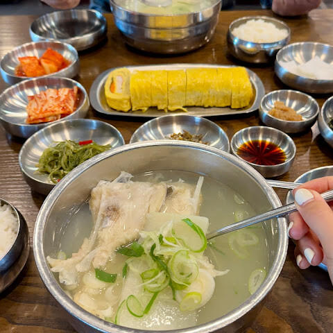 이곳은 벽면에 유명인들의 사인이 가득한 아주 인기 있는 가게입니다. 음식도 훌륭한데, 대구를 넉넉하게 담아 큰 그릇에 담아주어 먹고 나면 속이 개운해집니다. 에그롤도 맛있습니다. 국물은 살짝 매콤해서 어른들이 특히 좋아합니다. 아이들은 김밥과 대구를 곁들인 김밥을 먹을 수 있습니다.