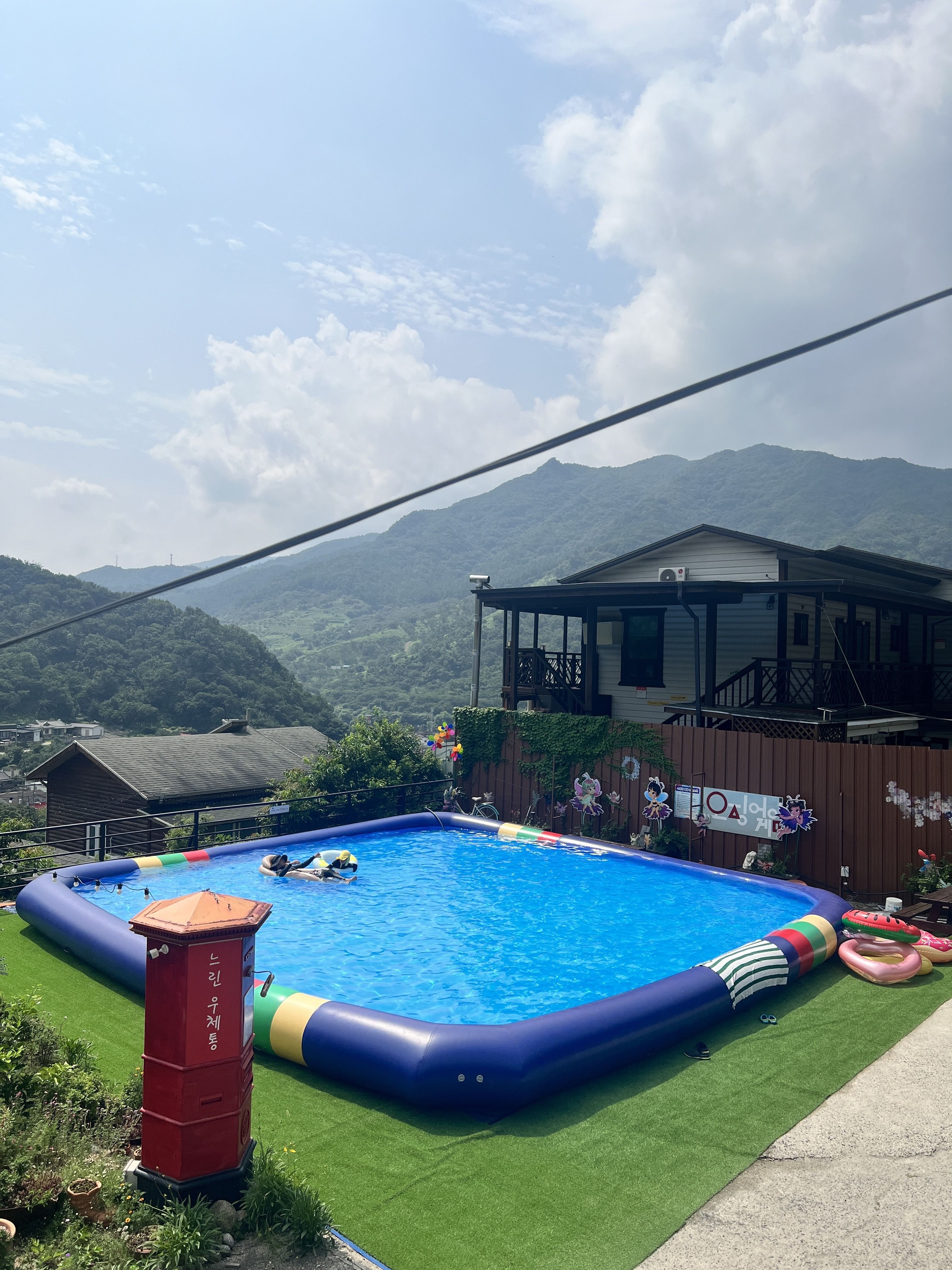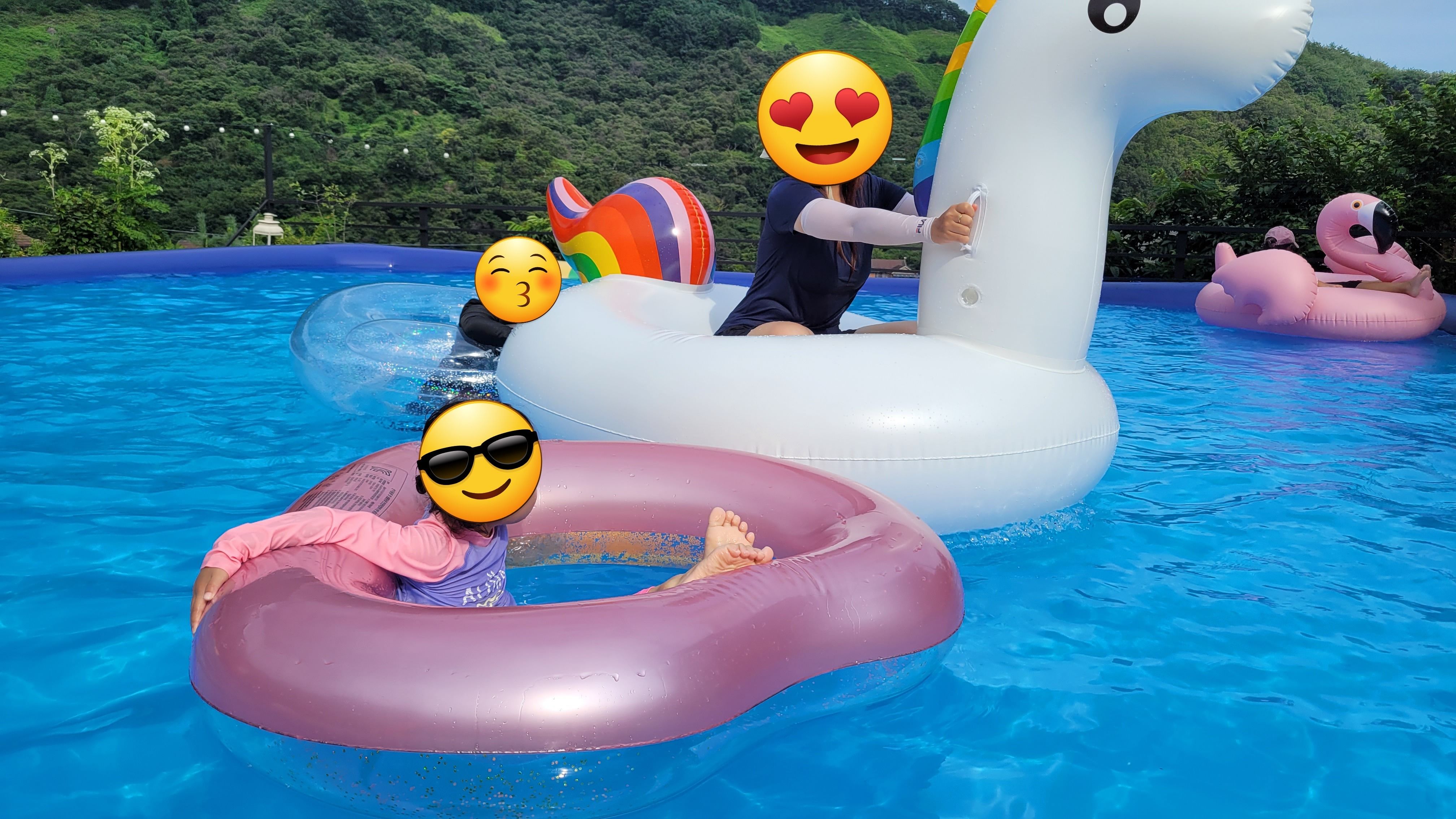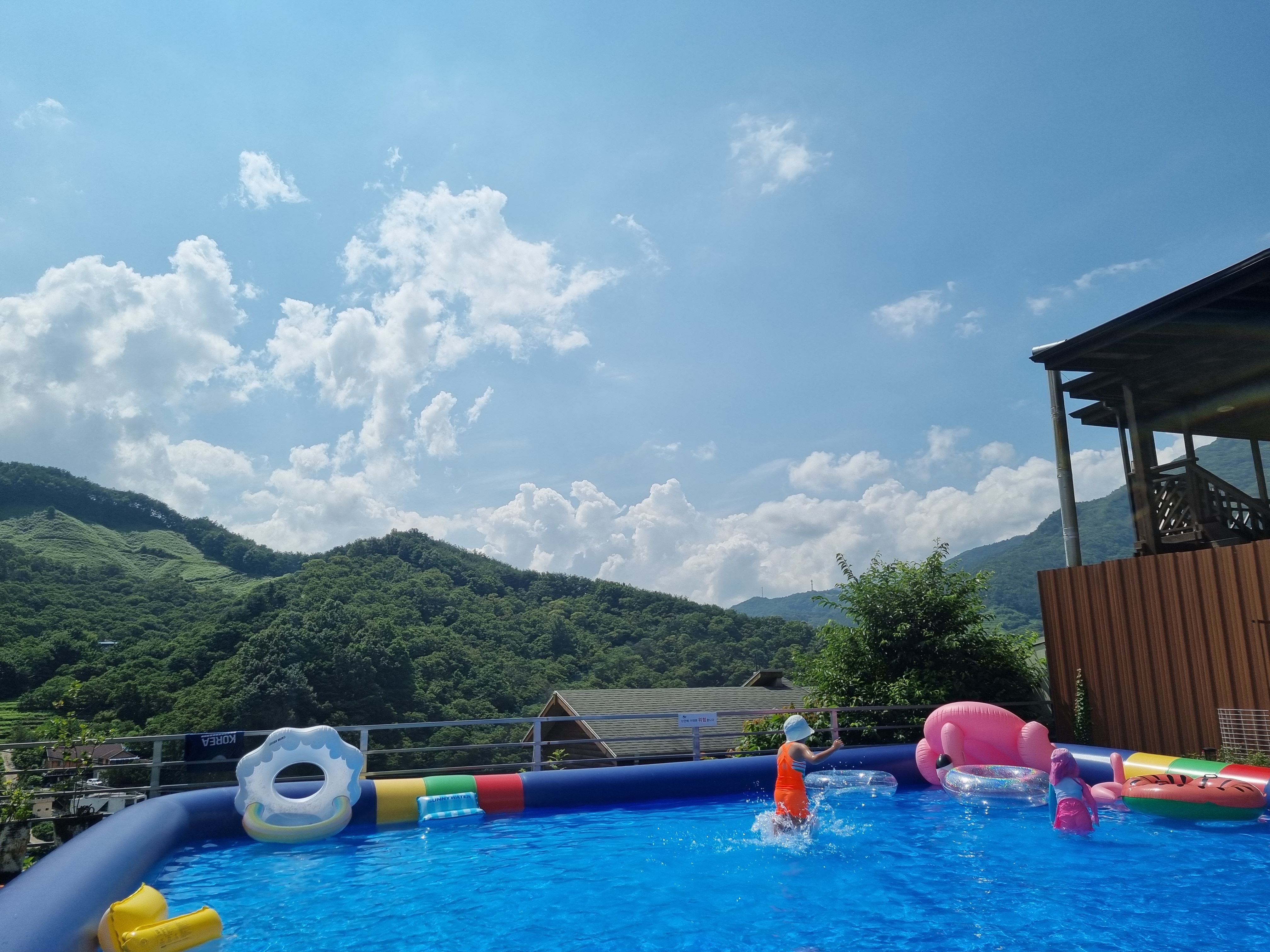 피아골계곡에서 놀고, 숙소에 마련되어 있는 수영장에서도 놀고~ 수영장에서 놀 때 주인부부께서 튜브도 듬뿍 넣어주시고 계속 신경써주시더라구요.