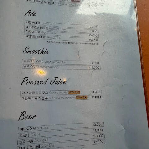 산방산이 주차장 및 카페 뒤로 보이기는하는데 뷰는 그게 끝이고 앞쪽은 선베드 같은게 있는데 거기 누워서 바람쐬며 음료 마실수있습니다. 음료나 디저트는 쏘쏘했서요.