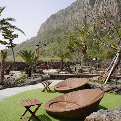 산방산 용머리해안변에 위치해서 바다뷰가 좋습니다. 조경과 야외테이블도 잘 배치해뒸구요